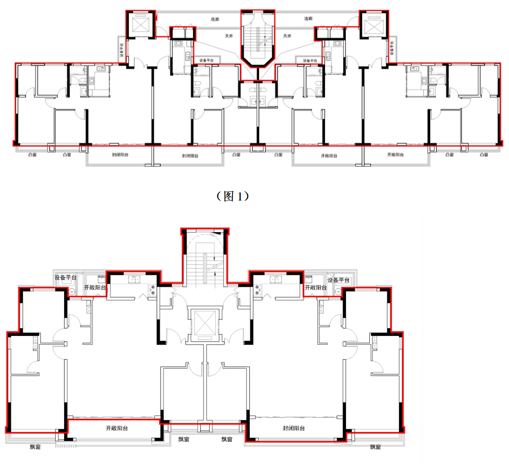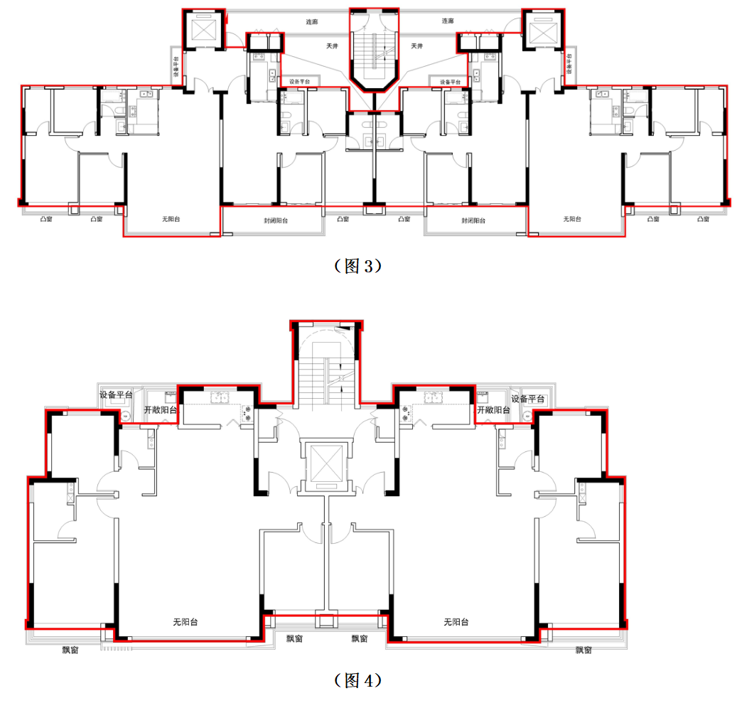 注:图1示意含有主体结构外阳台设计的建筑单体外墙范围。图2示意含有主体结构内阳台设计的建筑单体外墙范围。图3和图4示意无阳台设计时,建筑单体的外墙范围。