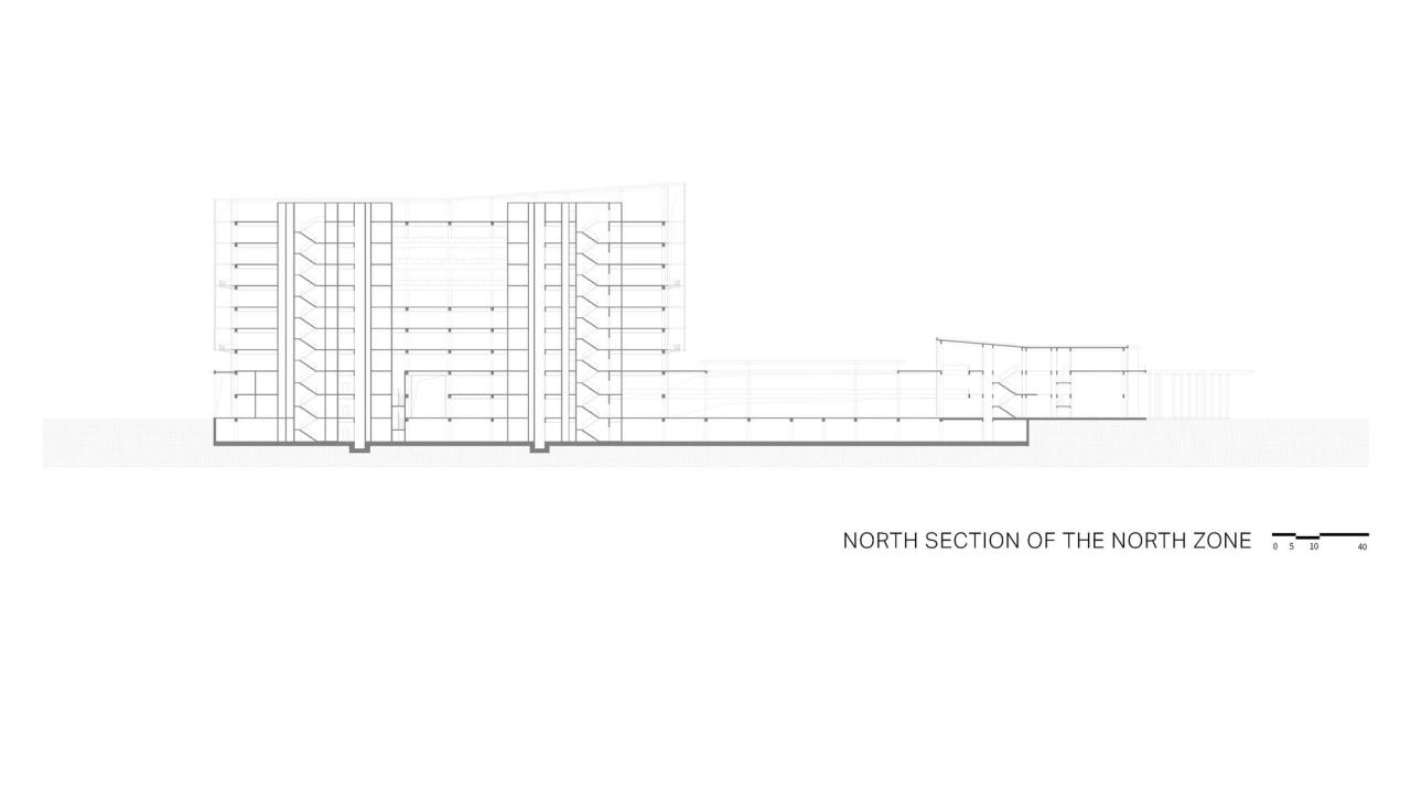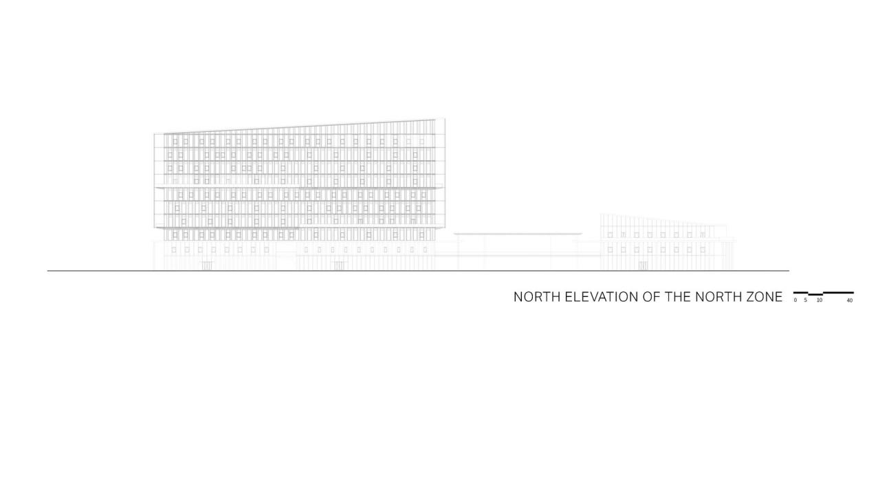 北区的重心在教学、行政和生活,综合行政楼是整个校园的门户形象,行政楼的下方衔接裙房,联结会议中心、体育馆、国际交流中心、宿舍楼,形成的庭院式布局围合出中央草坪。体育馆的东西侧,以连贯折叠门分隔室内外空间。国际交流中心采用退台式布局,最大化景观效应。南区建筑的南北立面的使用轻盈且线条清晰的白色陶板。第五立面结合建筑造型充分满足了屋顶设备的设置和隐藏。北区建筑群立面以水平元素为主,其中综合行政楼南北立面采用乳白色铝板的垂直水平排列组合,东西立面则采用双层幕墙体系,为室内创造更好的自然采光和通风节能减排。