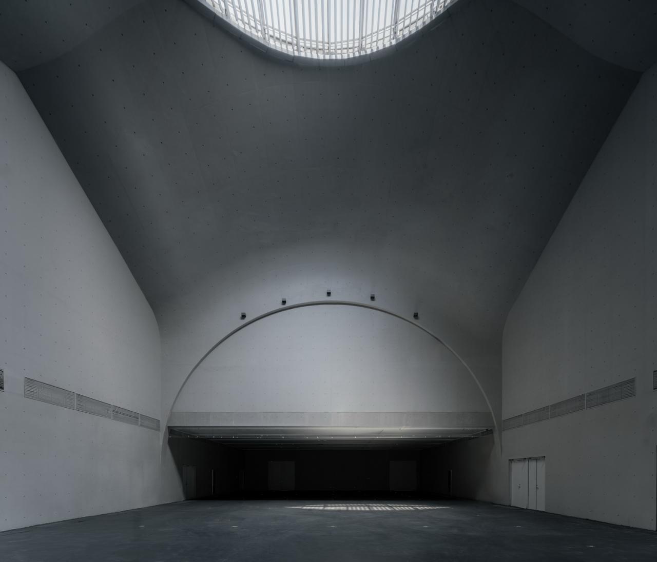 当我构想空间的时候,我想利用地下建筑这个切入点去表现“深”。也想用超大尺度让人失去方向感去改写我们习惯的直线的时间轴。最后我确立了中心是仿佛展翼的双曲面穹顶,18m×27.5m边长,16.5m为最高点的结构单元作为空间节点。整个艺术宫有三个彼此联系的空间节点,它们是我试图引导观众在Deep time作为背景引导下去理解生命,历史,环境和社会密切关系而得以审视自己未来的发展方向以及生存和生活方式的plot。