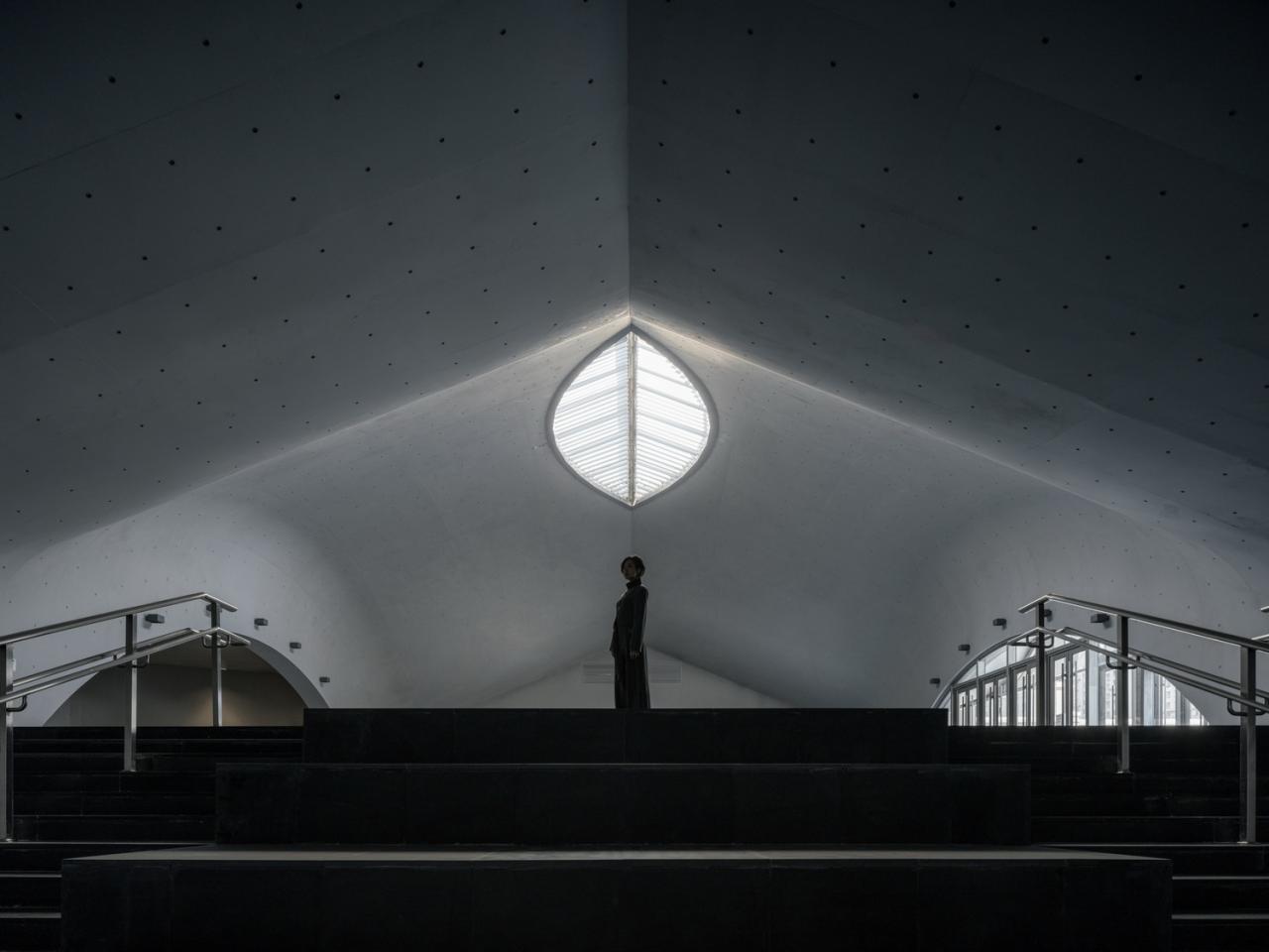 审视这个词让我联想到了眼睛。我决定在突破地面的双曲面薄壳穹顶开设眼睛形状的天窗。把天光引导到地下来。眼睛有着显而易见的象征意义,更可以强化天光塑造观众体验和观念。它会帮助观众重新在人生很短的一个时间段里理解不同的时间观。