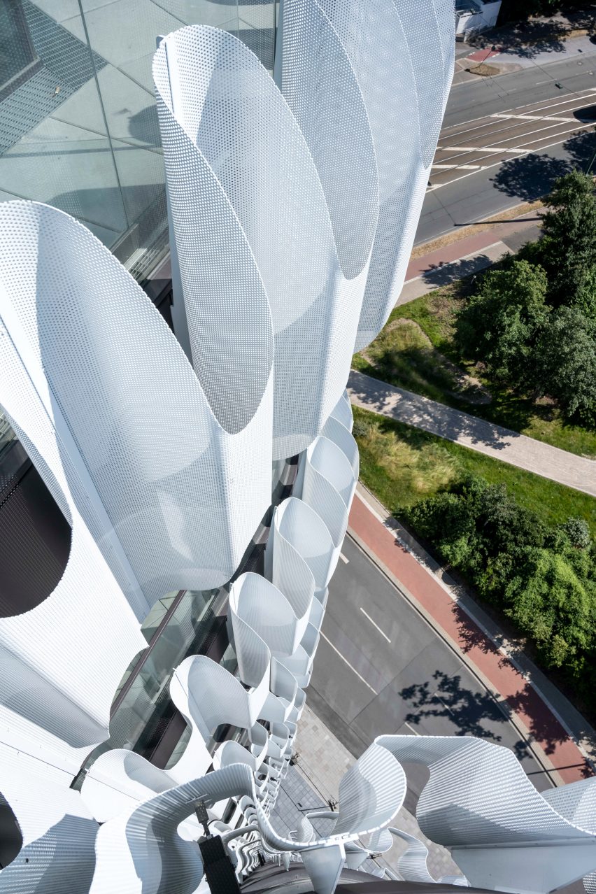 RKM 740塔楼最显著的特点是所有立面都采用了穿孔覆层。这种金属屏风可以保护玻璃幕墙免受阳光和风的直射。覆盖层的密度在不同的高度上发生变化,从东侧、南侧和西侧的大致开放模式转变为北侧的更加封闭的配置,从而为附近道路的噪音提供屏障。