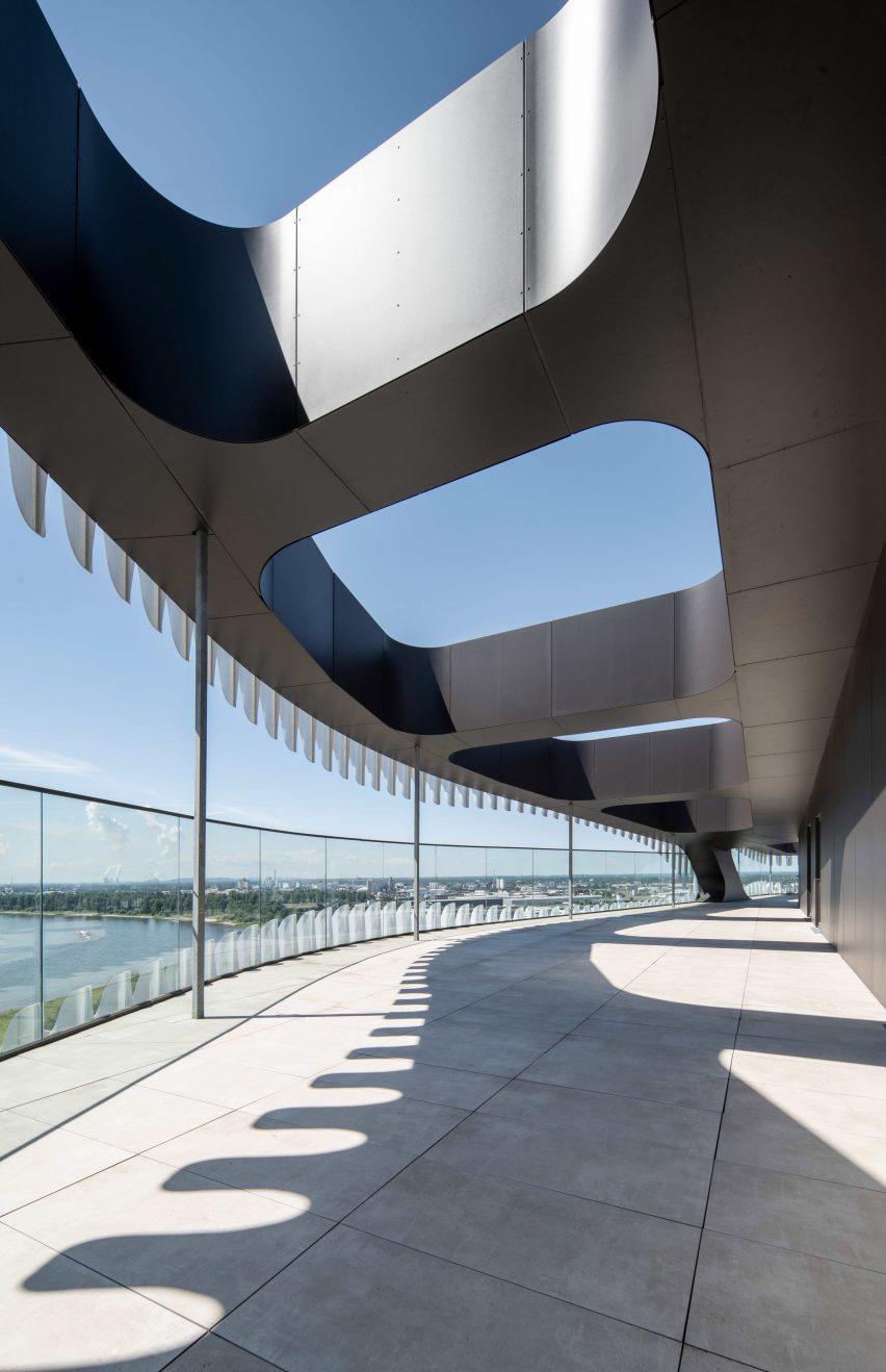 这个名为RKM 740的塔楼位于莱茵河河道的第466英里(740公里)处,贯穿杜塞尔多夫-赫尔特街区(Düsseldorf-Heerdt)。迈尔建筑工作室(J Mayer H)在2011年赢得了设计这座塔楼的国际竞赛,该塔楼包含多个医疗设施和位于Dominikus Krankenhaus医院旧址的公寓。