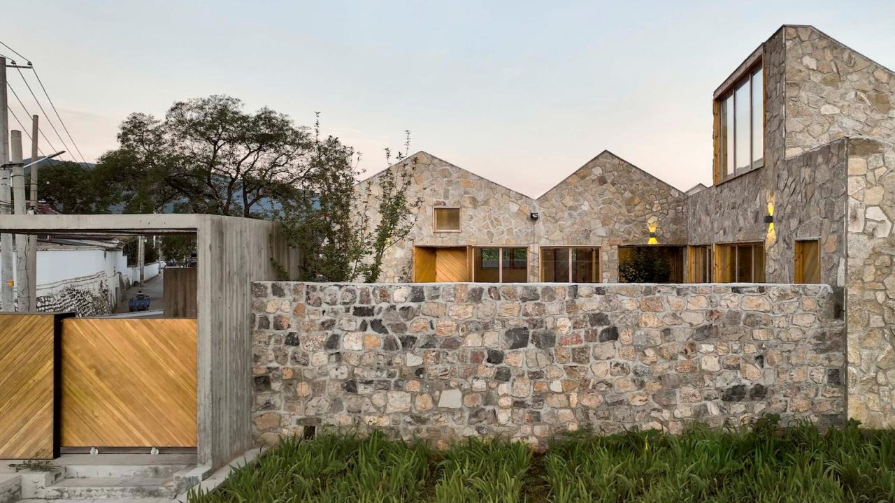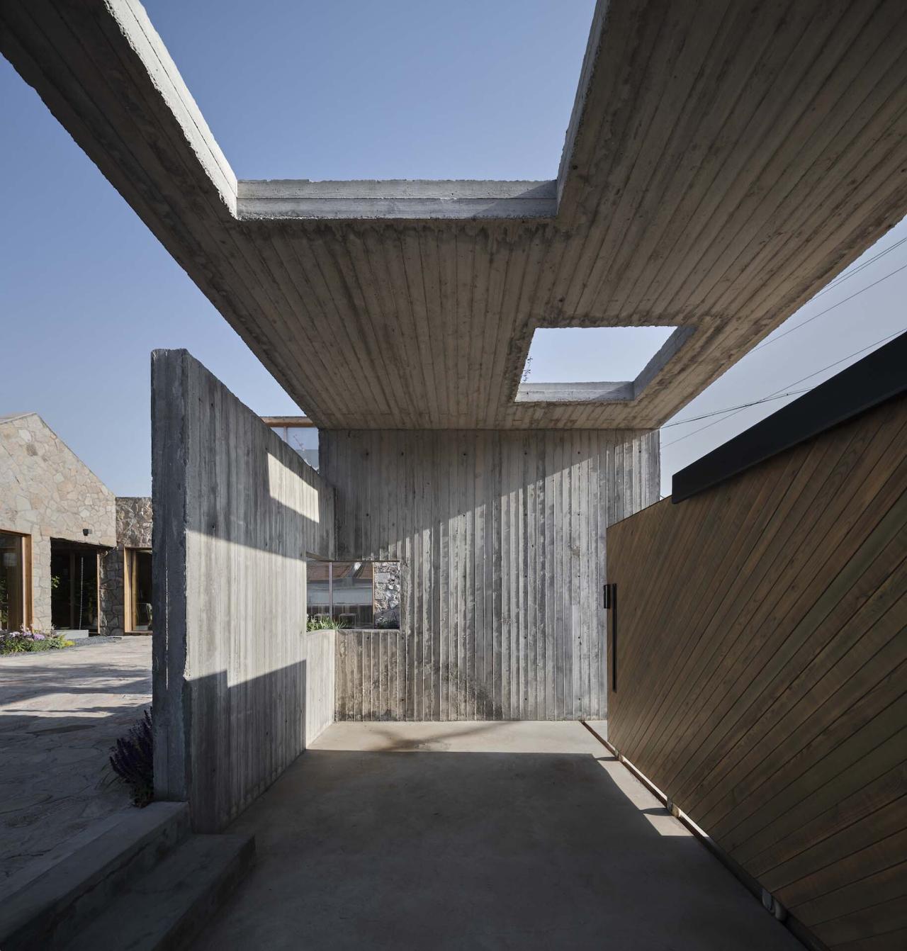 材料使用设计采用了片岩作为折山院的建筑外墙和景观地面材料,结合着土法砌筑的毛石围墙,让建筑、景观和环境浑然一体,也希望能够因此延续中国北方山区乡村原有的粗犷有力的建筑性格。折山院的入口是一个放大了的雨棚,采用小块木模板的混凝土一次性浇筑完成,在增加了粗野感的同时,在色彩上与村里普遍使用的灰白色围墙产生呼应。