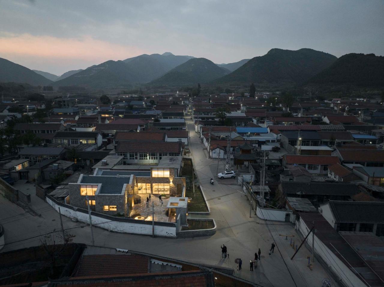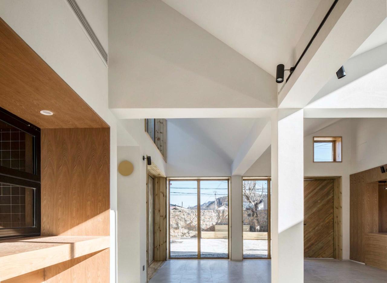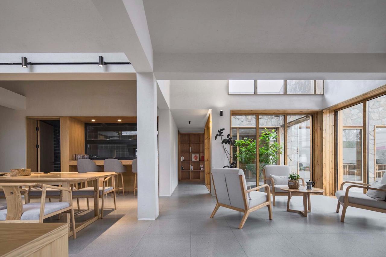 在城市之外的乡村环境进行设计工作时,我们希望能够完成一个转换的过程——在当代的建筑语汇和建造系统中部分地使用传统材料,使之在消费需求、乡村环境和建筑形式等多个要素之间达到平衡。折山院通过置入连续翻折屋顶调整了建筑形态,并因为这一组空间操作带来了建筑中一系列采光和观景的窗的体系,以及正反坡的屋顶下方的特别空间体验。设计将院内原有的两栋独立的房子转变为互相关联的一组建筑,产生了一个干燥、有力的,具有有北方山村特征的整体形式,形成了村里的“新的面孔“。