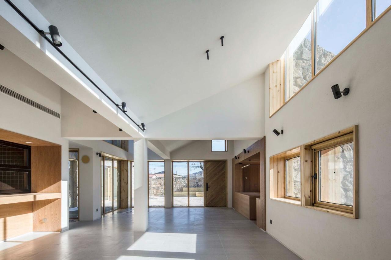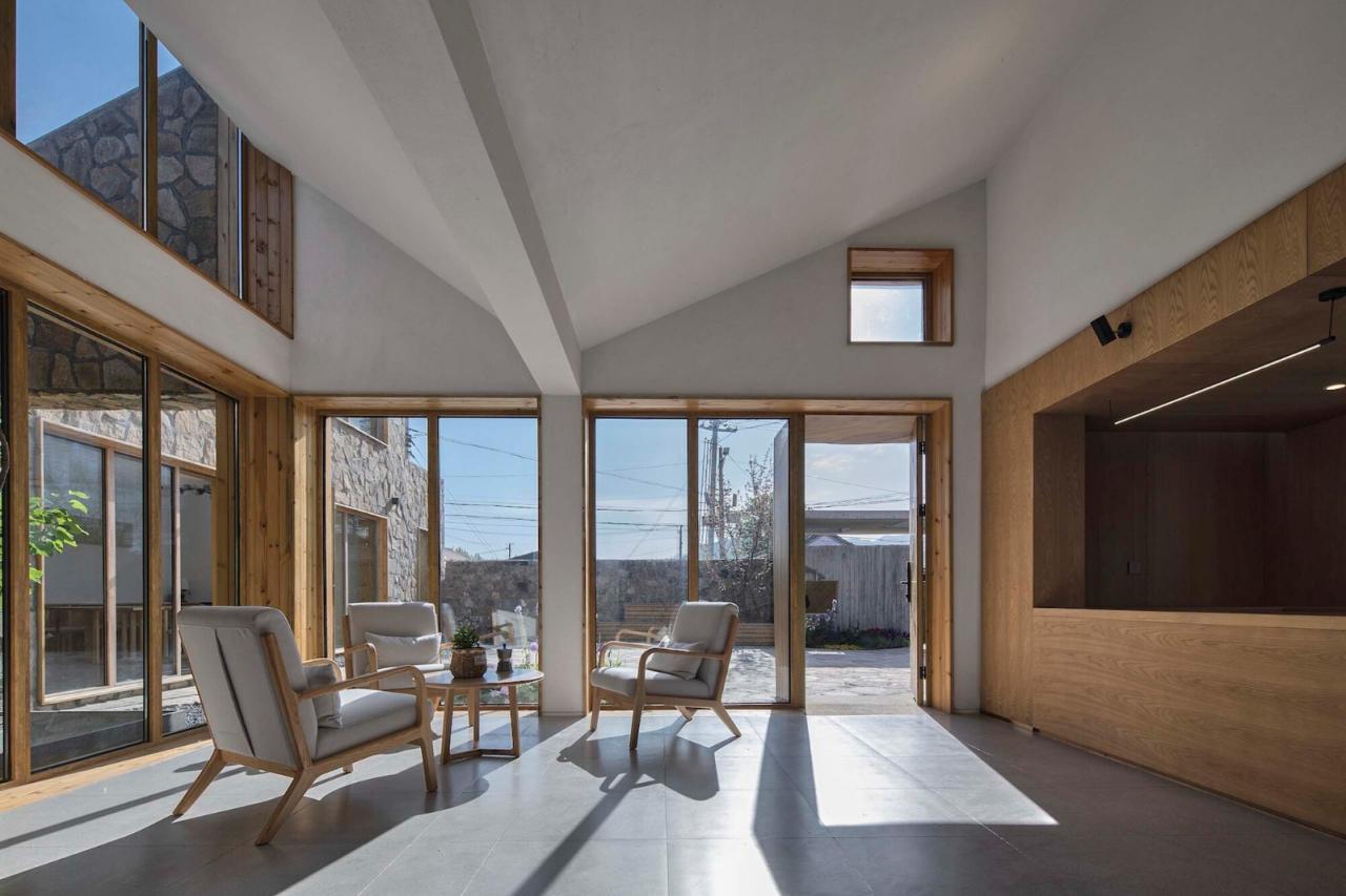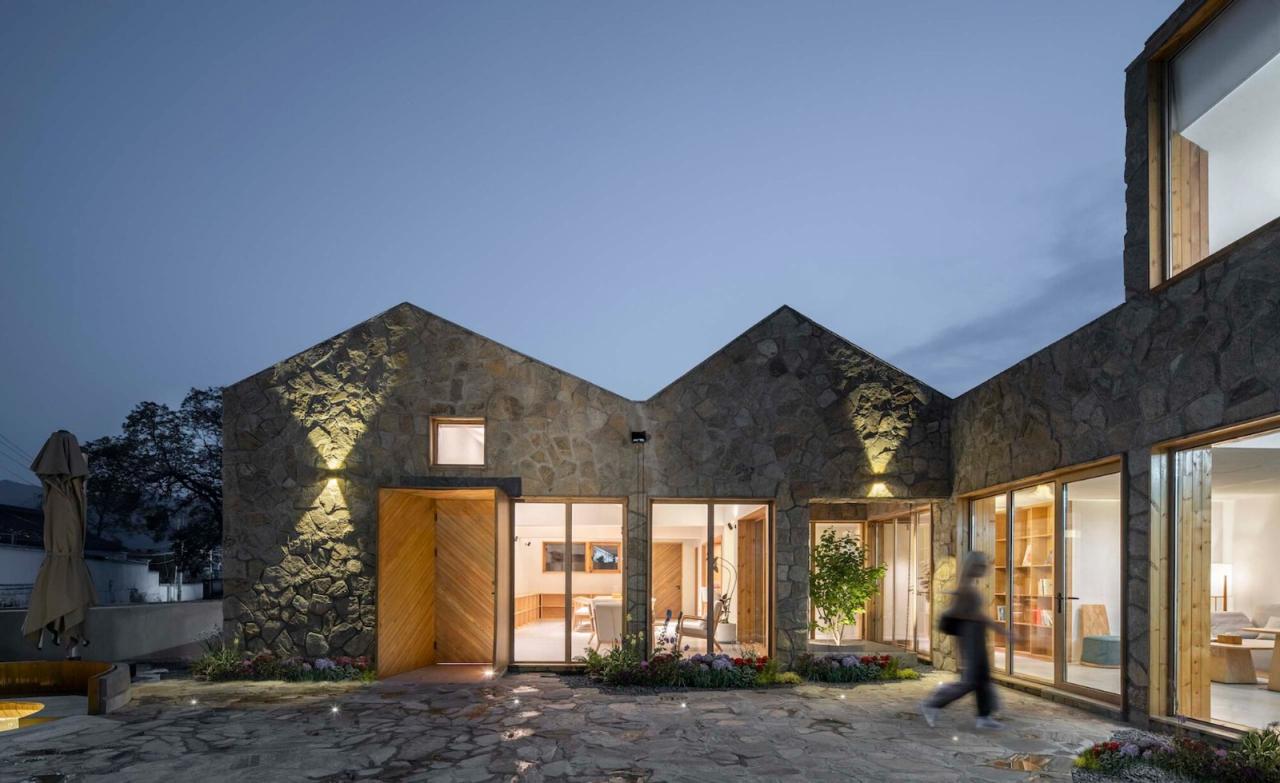 在城市之外的乡村环境进行设计工作时,我们希望能够完成一个转换的过程——在当代的建筑语汇和建造系统中部分地使用传统材料,使之在消费需求、乡村环境和建筑形式等多个要素之间达到平衡。折山院通过置入连续翻折屋顶调整了建筑形态,并因为这一组空间操作带来了建筑中一系列采光和观景的窗的体系,以及正反坡的屋顶下方的特别空间体验。设计将院内原有的两栋独立的房子转变为互相关联的一组建筑,产生了一个干燥、有力的,具有有北方山村特征的整体形式,形成了村里的“新的面孔“。