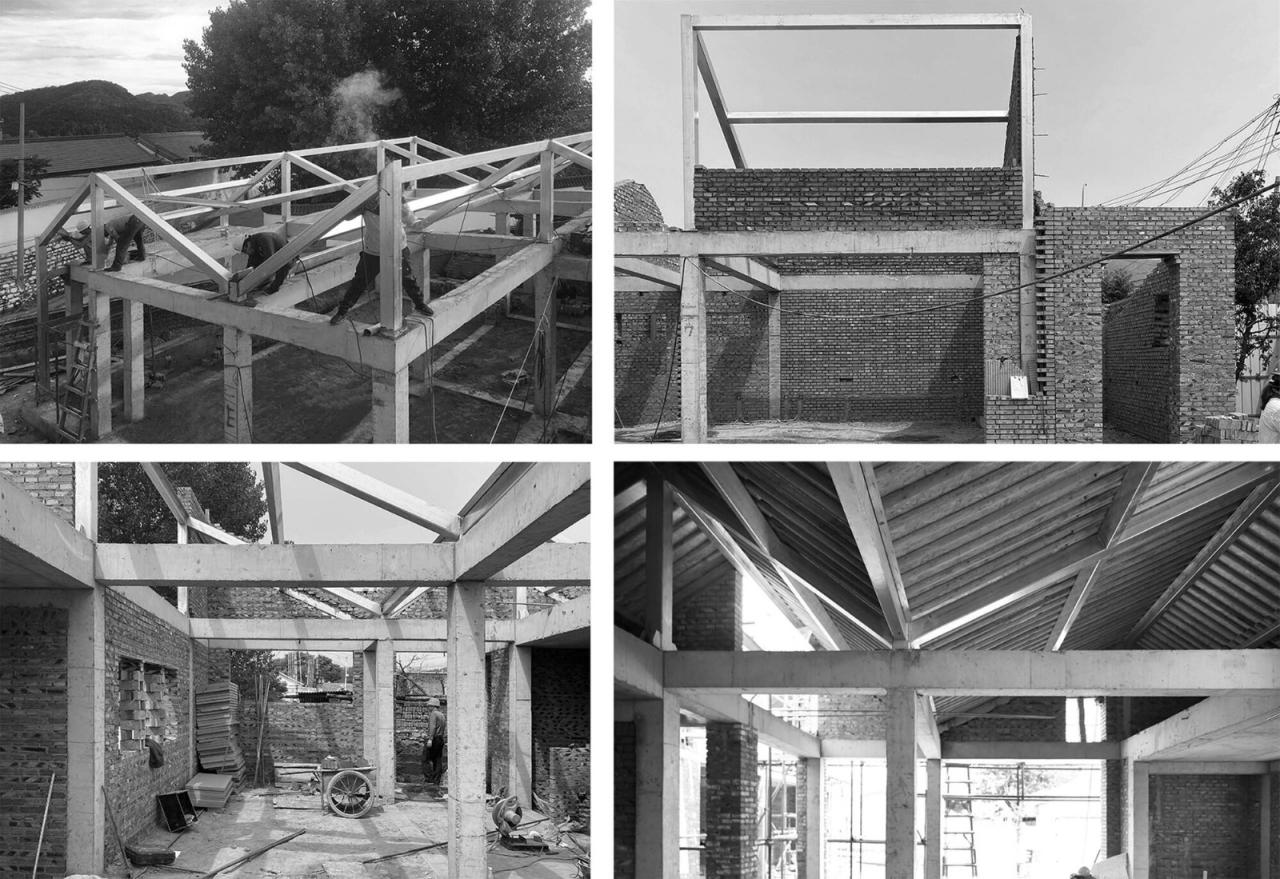 该院子之前已经进行了一轮重建,在我们接到委托之时,建筑的主体混凝土框架结构和部分屋面已经完成。建筑占地约180平方米,由一个正房和一个厢房组成,正房和厢房都是一样高的双坡屋顶,并沿东西向作为长轴方向,但厢房进深比正房大,比例不是很协调。