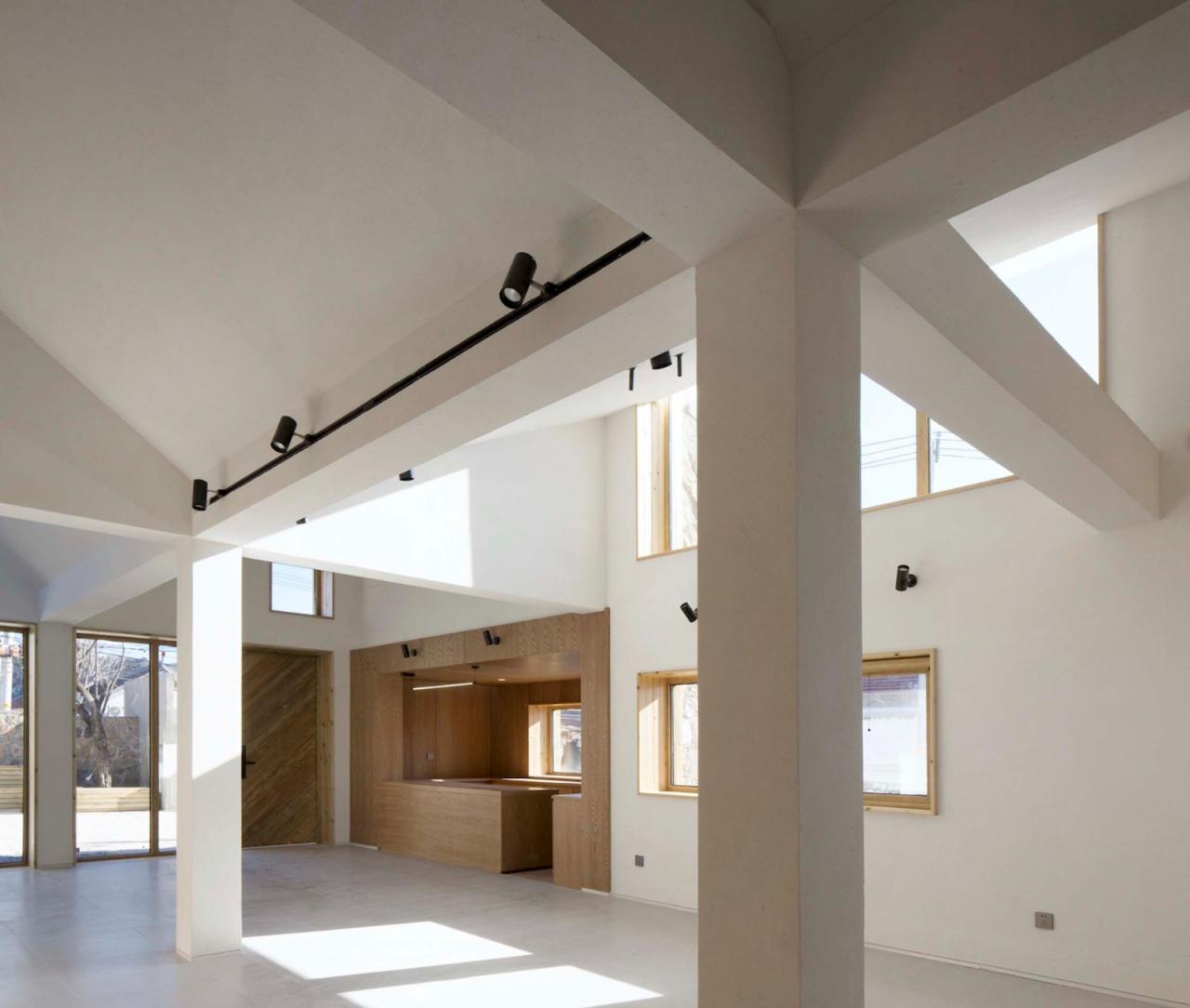 如何因地制宜地进行改造是设计的出发点,我们基于原有的混凝土框架结构,通过这一个连续翻折的屋顶重新定义了建筑的主次秩序和建筑形态:正房被局部加高,厢房的屋顶由两片变为四片。连续的屋顶抽象了村子周围的山脊形态,并带来了建筑南北侧的高窗。从外部的村子里看过来,南侧的大高窗定义了该建筑公共功能的属性,并可以在夜晚具有很好的标识性;从建筑内部看,南北侧的两个高窗给厢房里的工作坊空间带来了挑高空间和明亮的光线。