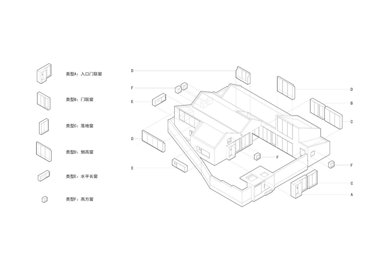 窗的体系相比于其他居住功能的院子来说,折山院主要是作为公共活动使用,因此设计中大幅度增加了窗的使用从而加强了建筑内外的互动和空间渗透。根据使用位置的不同,我们设计了四种窗的样式:南北立面反坡顶下的大高窗、朝向院子里的落地窗、观景和通风的组合窗、以及高处采光的小方窗。这种多样式、多方向的开窗方式,让建筑中各个地方都有角度看到近处的树林和远处连绵的山。