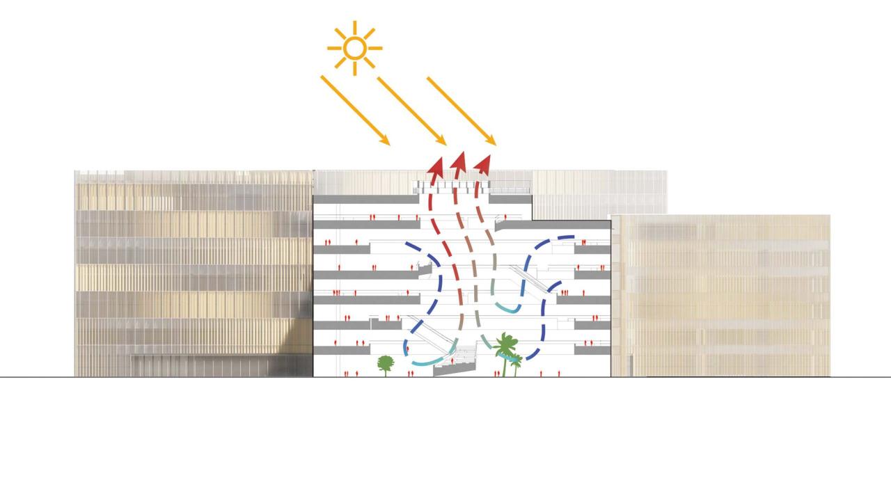 “智能立面”为位于大楼每翼的办公区域引入了自然光线,以及优越的可见度,同时借助先进技术来优化室内空气质量和温度。建筑中庭顶部设有电动可开启窗,在室外温度和空气质量适宜的情况下,对建筑内部进行自然通风,将优质的室外空气引入室内,增加室内的健康指标及舒适度,同时还能够实现长期的运营成本节约。