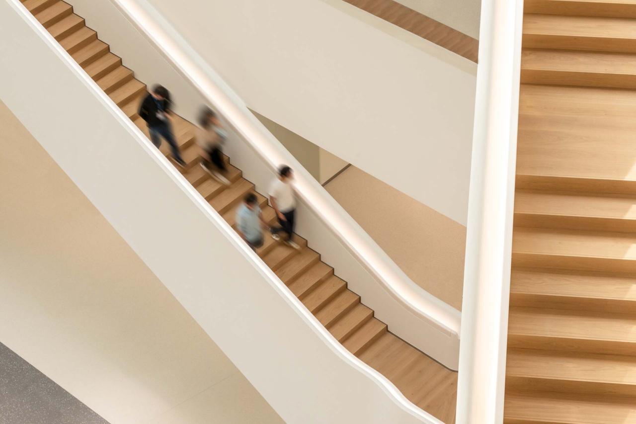 作为整座建筑的空间及视觉中心,设计团队打造了一个7层通高的中庭空间,将位于五翼的办公空间紧密联结在一起,并围绕中庭空间布局灵活会议空间,供创意讨论、交流协作的“第三空间”。围绕中庭布局的“社交楼梯”仿若一座视觉雕塑艺术品,连接各个楼层,旨在鼓励员工步行前往其他空间,使不同部门之间的互动和“不期而遇”成为可能。楼梯的动线设计还造就了若干与主中庭空间相连的“口袋中庭”,使室内空间更加灵动。根据Gensler办公空间调研报告,员工间的协作会显著的提升工作效率,建筑中庭周围的开放式动线为跨部门协作提供了平台。位于建筑五翼的办公空间,更多为员工提供深度思考及专注办公的空间。灵活的空间布局也可以更好地满足未来办公的增长需求,打造一个混合空间来满足员工社交、学习、协作、专注等各类工作模式。高效的平面布局,确保各个办公区域的员工都可以以最短的距离抵达中庭。