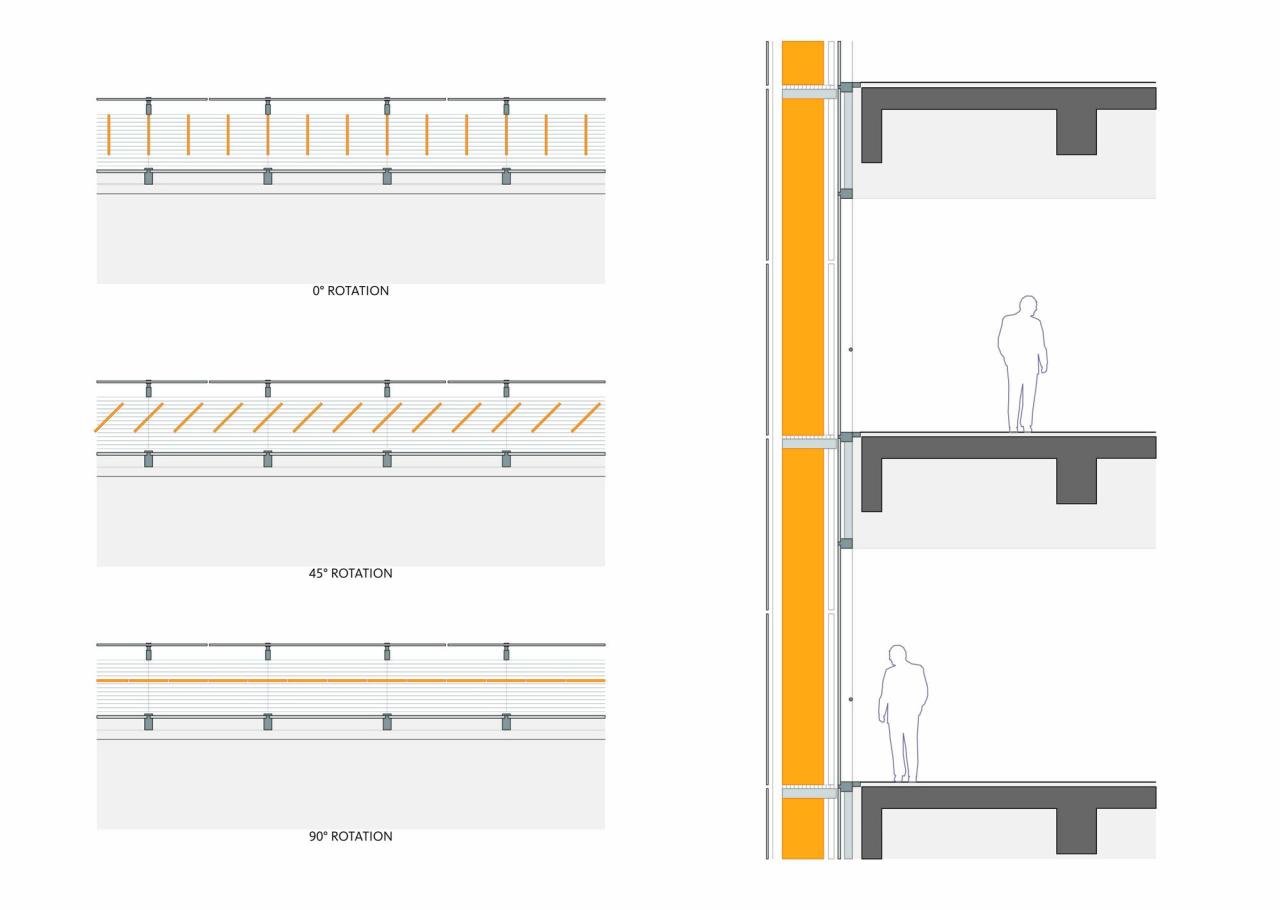 绿色、智慧的立面设计为助力长飞光纤的双碳目标及绿色发展战略,Gensler在项目的建筑设计中应用了领先的可持续设计策略,大幅提升了建筑在建造及运营中的可持续性能。设计团队从中国传统窗棂中汲取灵感,结合高科技幕墙技术,打造了智能的三层立面系统。建筑立面可以根据周边环境和光线条件的变化,通过传感器和内置电机来控制中间层遮阳百叶进行旋转,进而调节透过外立面进入建筑内部的光线和热量。智能立面系统使建筑能够优化自加热和自冷却性能,可以更好地应对高温、暴晒、强降雨等各种极端天气,具有出色的节能效果,为员工营造舒适的室内环境,并营造出多变的建筑外观效果。