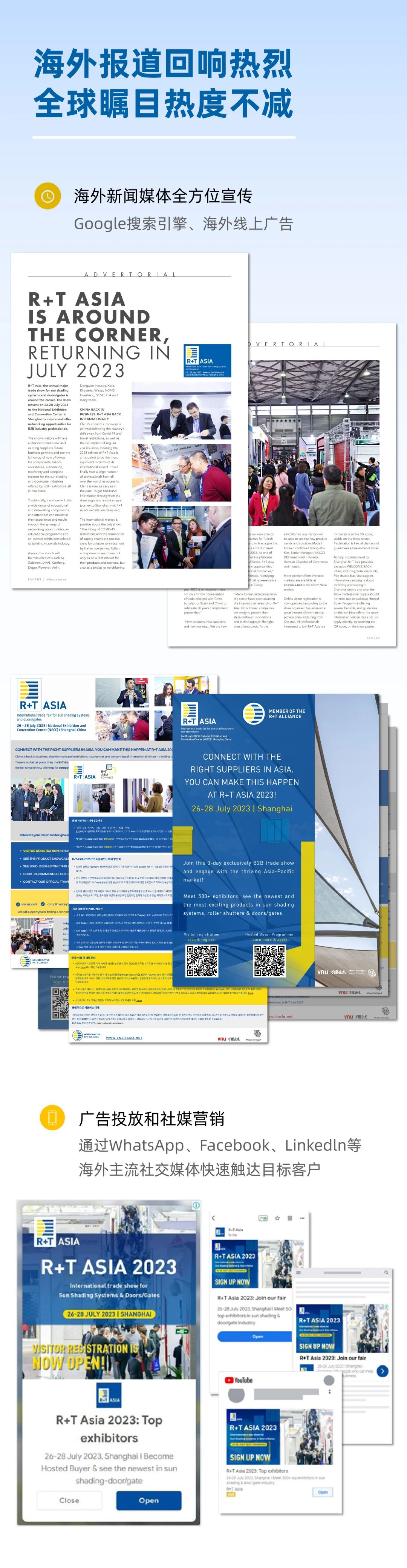 R+T Asia 全球推广计划▲R+T全球推广计划——美国站同时,我们利用多年来全球推广积累的各国媒体资源,广邀海内外媒体持续发声,多语言同步传播R+T Asia最新信息,保持资讯活跃度,持续扩大企业的曝光率与影响力。