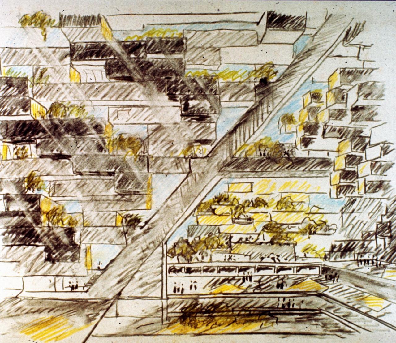 △栖息地67最初构想–草图 ©Safdie Architects