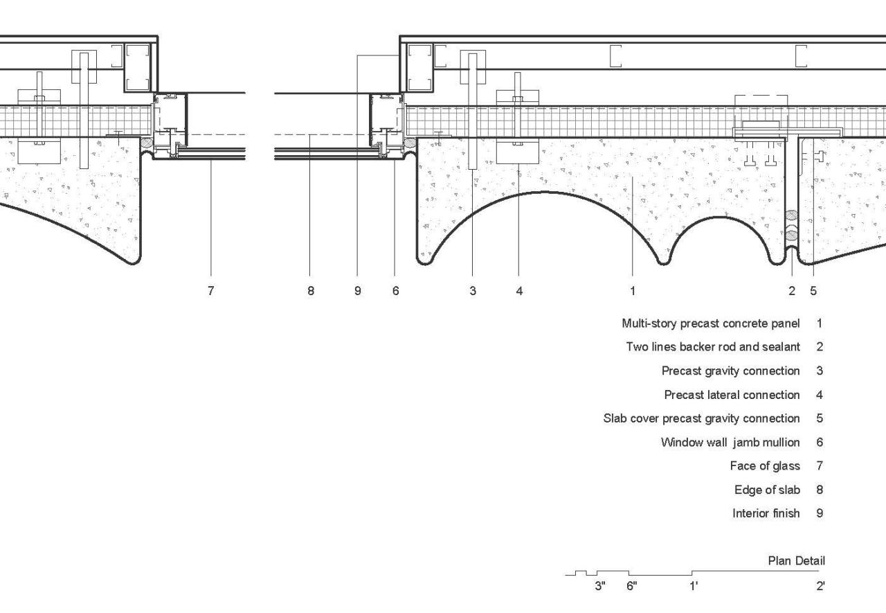 这些面板在工厂被仔细地标记和订购,并按照确切的安装顺序装上卡车。在现场,面板用起重机直接从卡车上取下并悬挂在建筑上,省去了耗时的安装支架搭设过程。住宅单元的玻璃采用了从地板到天花板的窗墙形式,在混凝土板上间隔设置隔板玻璃。玻璃板厚度从两端 12 英寸到中心 5 英寸不等,这就使其具有戏剧性的深度和阴影,同时也使外墙可以部分自掩。