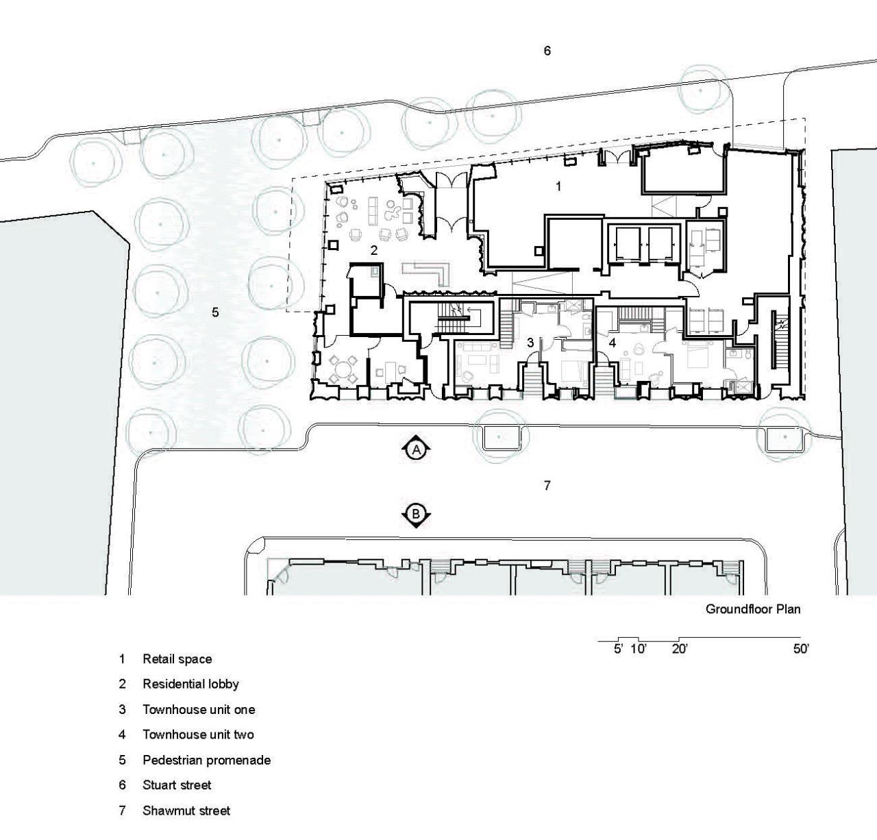 斯图亚特街 212 号在城市中以多种形体呈现。从远处看,该建筑与天空相接,有一个独特的剪影。在近处看,该建筑与地面相接,与人行道和街景相融,其门廊、花盆和铁制品与海湾村的住宅环境交相呼应。这座 19 层楼高的建筑还包含两栋联排别墅,使海湾村街景的北侧更加丰富。