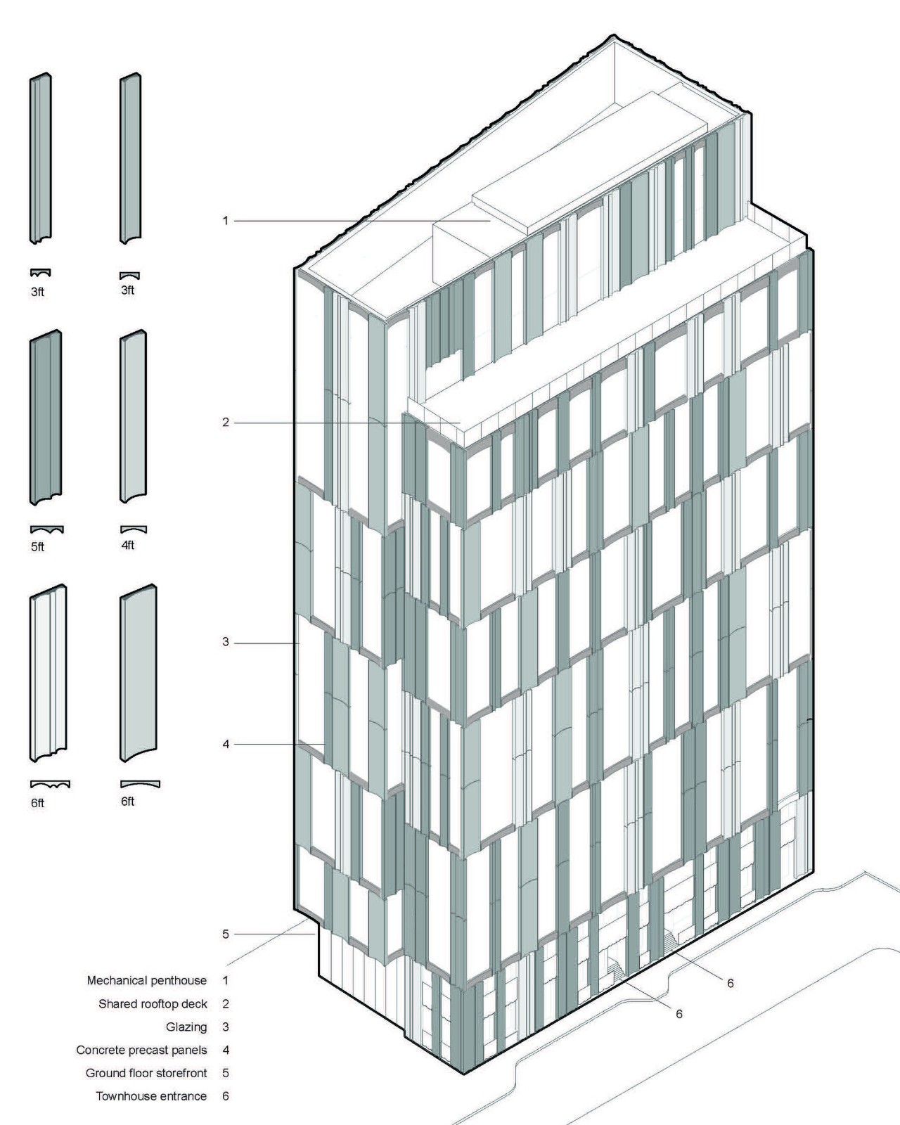 该项目的位置——一个小的、不规则形状的场地,以前被用作停车场–带来了一些设计限制,包括其紧张的城市环境。在设计和施工的早期阶段,建筑围护结构与预制混凝土制造商和外墙安装商进行了沟通协调,以减少施工中的摩擦。该设计突破了多层凹板的制造极限,通常有 20 或 30 英尺高,跨越 8 个主要模具,通过优化施工顺序来减少安装时间。不规则间隔的凹板(由BPDL 在当地制作)和多层凹陷的玻璃幕墙凸显了建筑的垂直度,创造了一个部分与整体的关系,使斯图尔特街 212 号在波士顿的天际线与众不同。