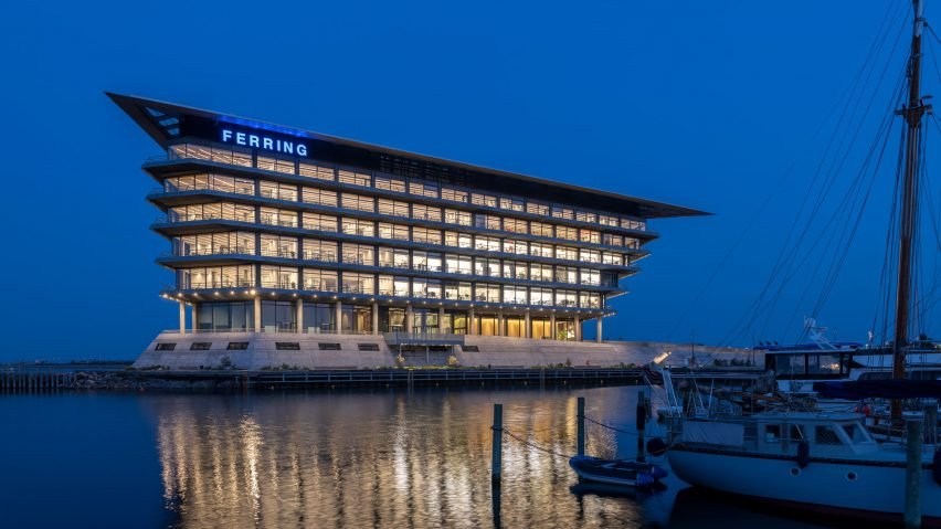 英国福斯特建筑工作室(Foster+Partners)在丹麦为费林制药公司(Ferring Pharmaceuticals)总部建造了一座带有悬臂屋顶的叠层玻璃建筑。
