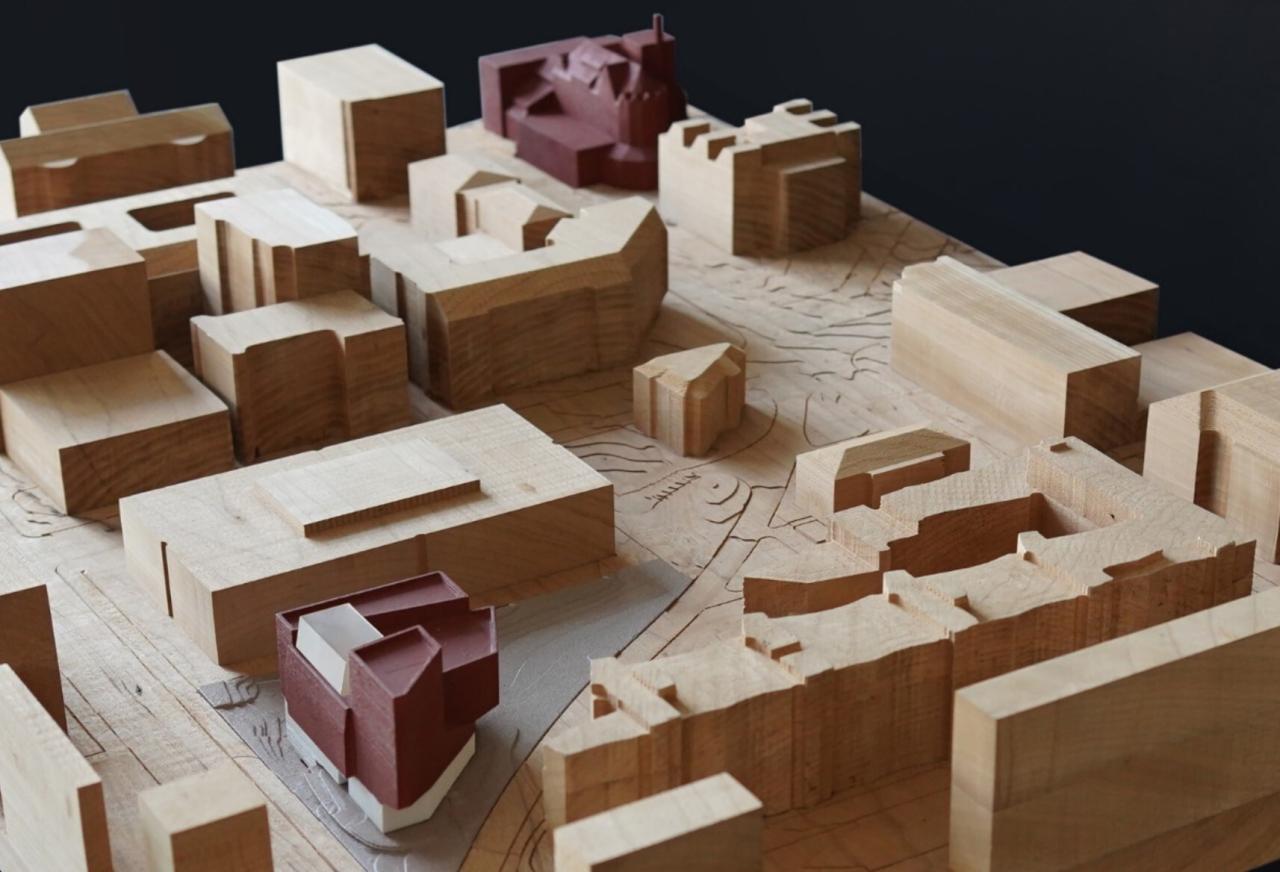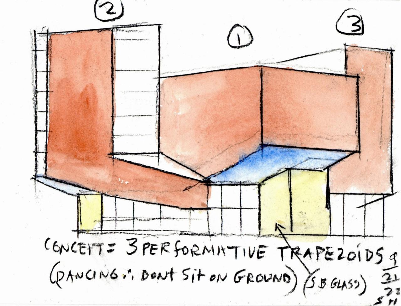 方案从舞者和表演者的动态动作中汲取灵感,采用了三个悬浮梯形的形式。透明和半透明的玻璃突出了项目框选的景观,红色陶土材料的使用让建筑融入校园环境。方案将新中心置于宾夕法尼亚大学校园的西北角,承担了入口门户的角色,邀请学生进入并探索校园的创意生活。