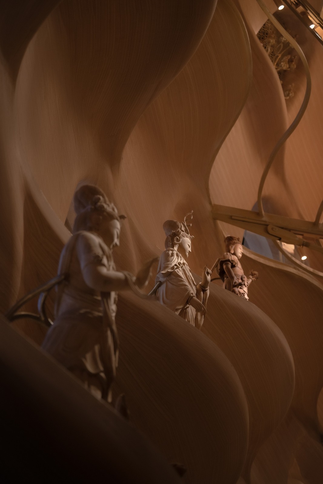 设计借鉴了“塔”这一建筑原型,在大殿中创造了一座空心佛塔,作为立体展陈木佛造像的主要载体。佛塔平面呈椭圆形,共七层,逐层向上收束,汇聚于矩形的佛殿空间顶端。佛塔内部以曼陀罗作为意向。曼陀罗意为坛场,即一切圣贤、功德的聚集之所,代表了佛教文化的宇宙模型。