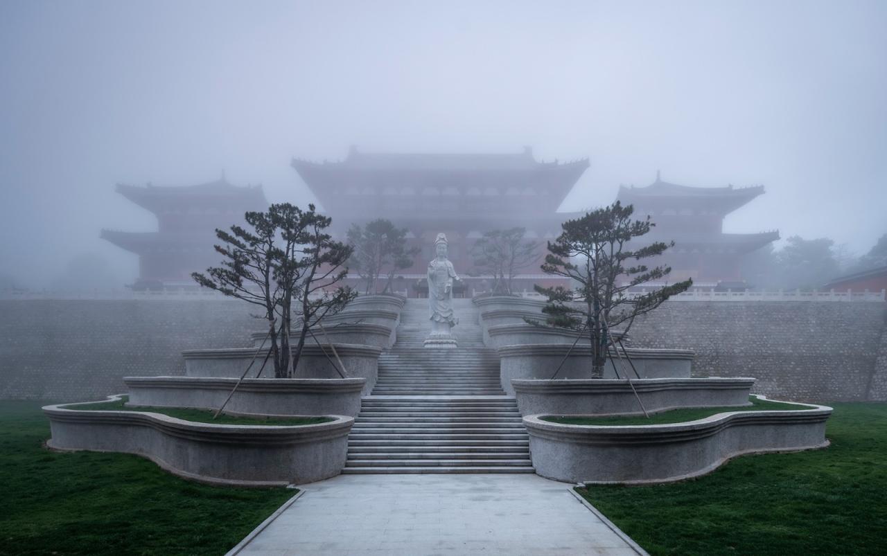 新的设计在延续寺庙中轴线以及保留观音石雕立像的前提下,对现有前区景观进行改造提升。为了加强进入博物馆的仪式感,前区景观被设定为“云台”,结合场地的高差条件,围绕中心台阶展开高度不一的七层水洗石阶梯平台。设计同时扩大了观音立像所在的休息平台,并将台阶的坡度适当放缓,以便于人的行走与停留。云台以柔美的曲线形态宛如祖山云雾逐层漫延开来,平台之上附有喷雾设施、草坪以及点景松树。当游客穿过不断变幻的水雾之云拾级而上,心情也逐渐平静下来,三座大殿才慢慢显露其真身。
