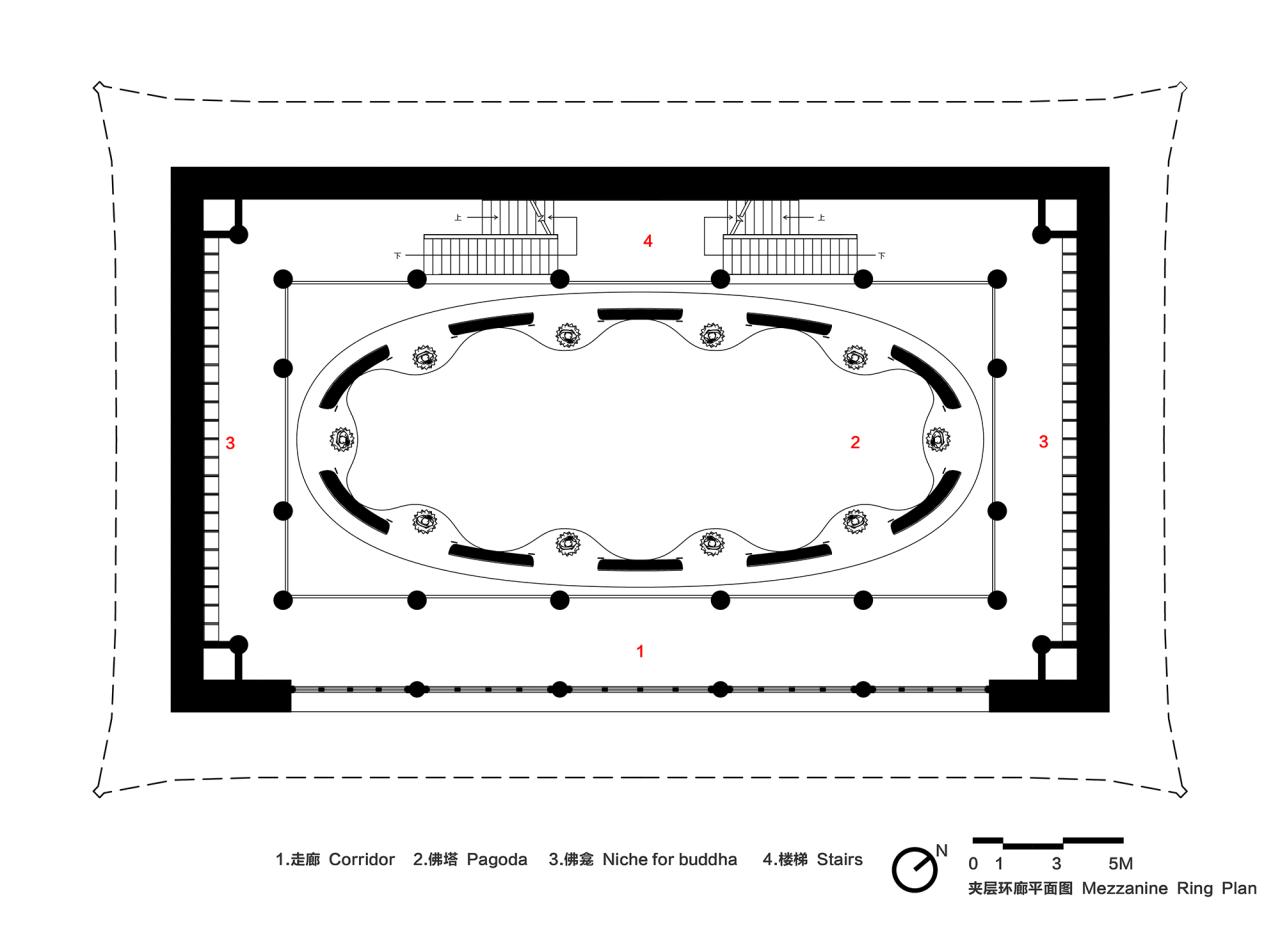 佛塔也催生了转塔这一具备祈福意味的环游路径。将已有建筑改造为首层、夹层环廊和顶层三个可以供人游走的平台,形成立体环游路径。首层塔身外侧书写有金刚经,可在转塔过程中细细品味。同时在首层大殿左右两侧设置了6尊观音化身立像供人祭拜。原有楼梯被适当的改造,将游人引向顶层。