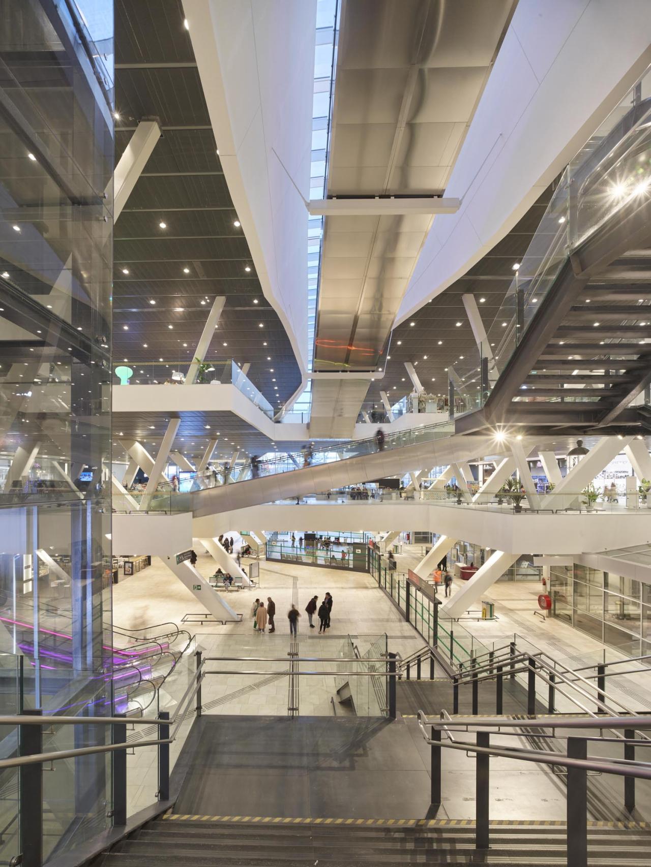 高铁站、公交站及商业中心的主入口和落客区都设置于较低的楼层,位于一个标志性的巨幅城市标识墙之下。在此,保留下来的原火车站立面被重新置于其旁,既欢迎人们的到来,也展现了这座城市的历史记忆。