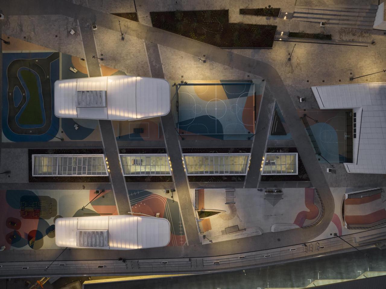 另一方面,它创造出一系列新的公共空间和商业空间,助力城市的社会经济发展——项目包括一个3万平方米的公共广场,内部设有滑板公园与运动场;以及一座拥有超过125家商家的商业中心,涵盖餐饮、零售、电影院等多种业态。