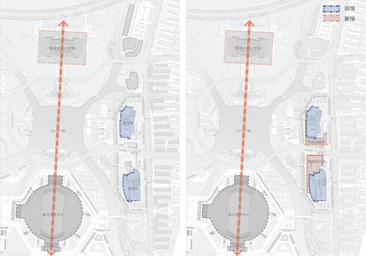 嘉兴博物馆图书馆改扩建工程位于嘉兴市“七一”广场以东,七一广场是城市政治形象的代表,广场中心建筑——南湖革命纪念馆(新馆)有着深厚的党和国家的历史与政治意义及背景。设计前期周边建筑基本上每个风格迥异,失去了与广场空间的呼应。因此在扩建设计中,更加注重遵循新旧建筑在空间,形态,材料等领域,以及与广场的的和谐与对话。