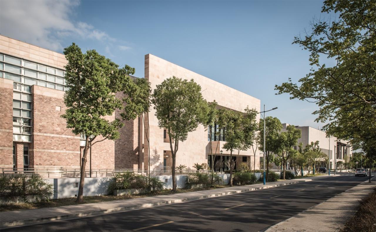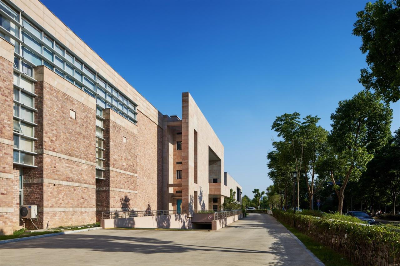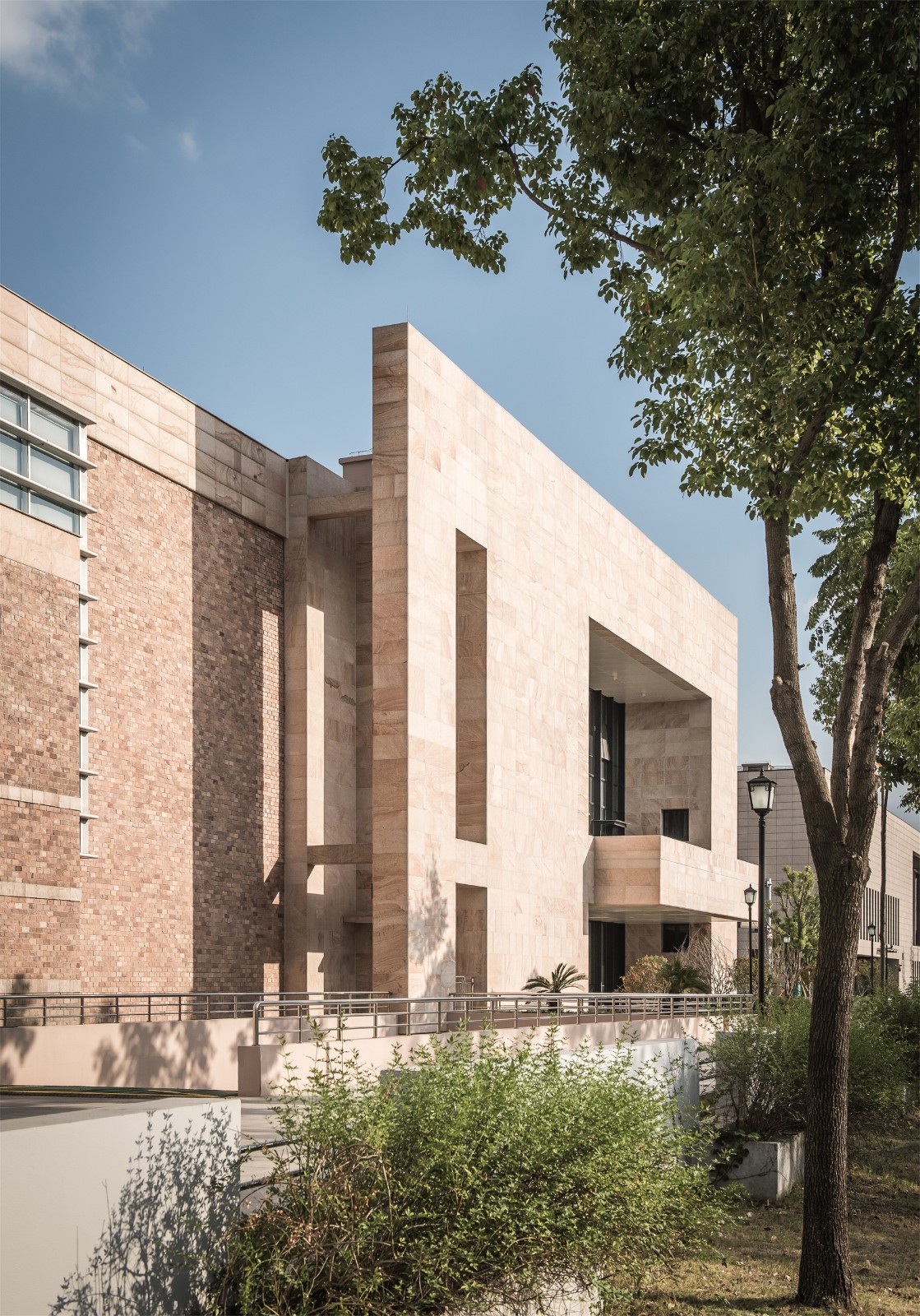 老图书馆立面的红色面砖已经不再生产,因此经过筛选,新馆立面采用了质感与色相类似的干挂花岗岩处理,既符合新的建筑设计与功能要求,同时与老馆也形成了友好的呼应与延续。