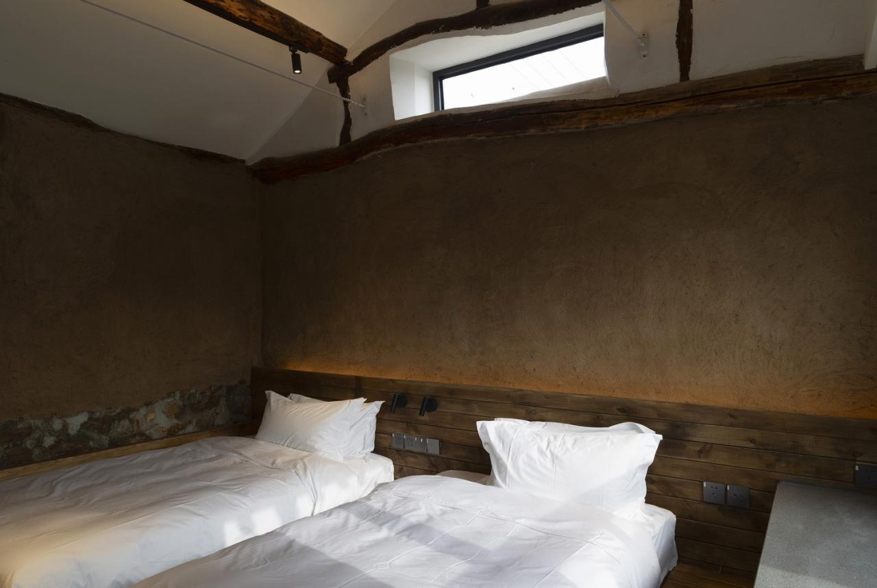 将院门改至东侧,引导人由桃园进入院内。入口的坐台开放给民宿客人及村民使用,让建筑融入到村落生活的场景之中。在场地布局上,我们让新、老建筑相互插接贯通,从而带来内部新老空间戏剧化的转变。新建筑屋顶向内院倾斜以呼应老建筑及村落风貌,利用倾斜的屋面高度差设置夹层空间,一方面提供了更多元的睡眠空间,同时也吸纳周围的景色进入庭院内、建筑中。