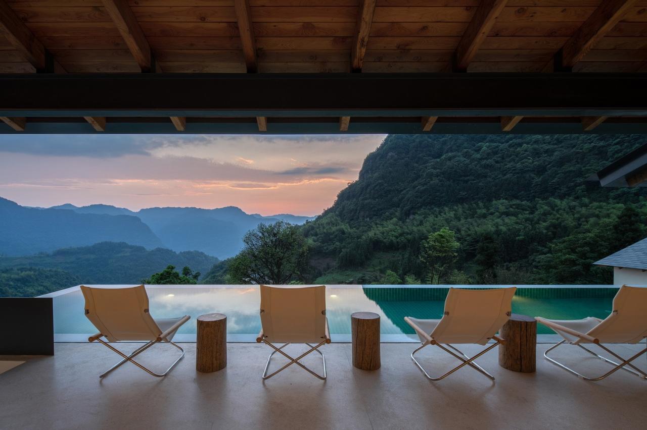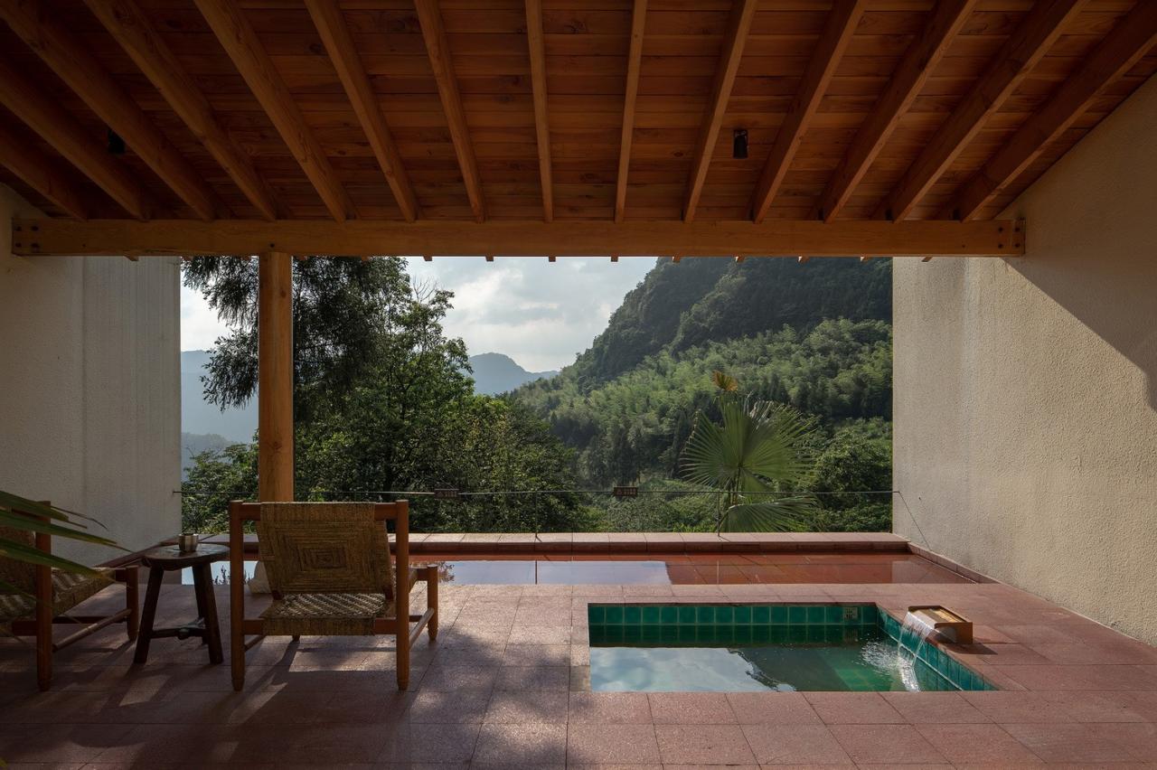 重庆江津四面山镇——“因四面山峰围绕,沟谷纵横,皆为大山而得名。”国内著名民宿品牌大乐之野在西南地区的第一家山居民宿,就选址在这四面群山环绕之中,空崆建筑受邀为项目进行了整体设计,希望通过这个项目让人们重新认识这片隐秘的美好之地。业主希望在项目中安排24间客房,并希望大部分客房能够有独立的私汤泡池以满足当地全年度假的需求。还需要配置足够大的餐厅、咖啡吧、茶室、泳池、厨房、布草、员工宿舍、停车位等配套设施。
