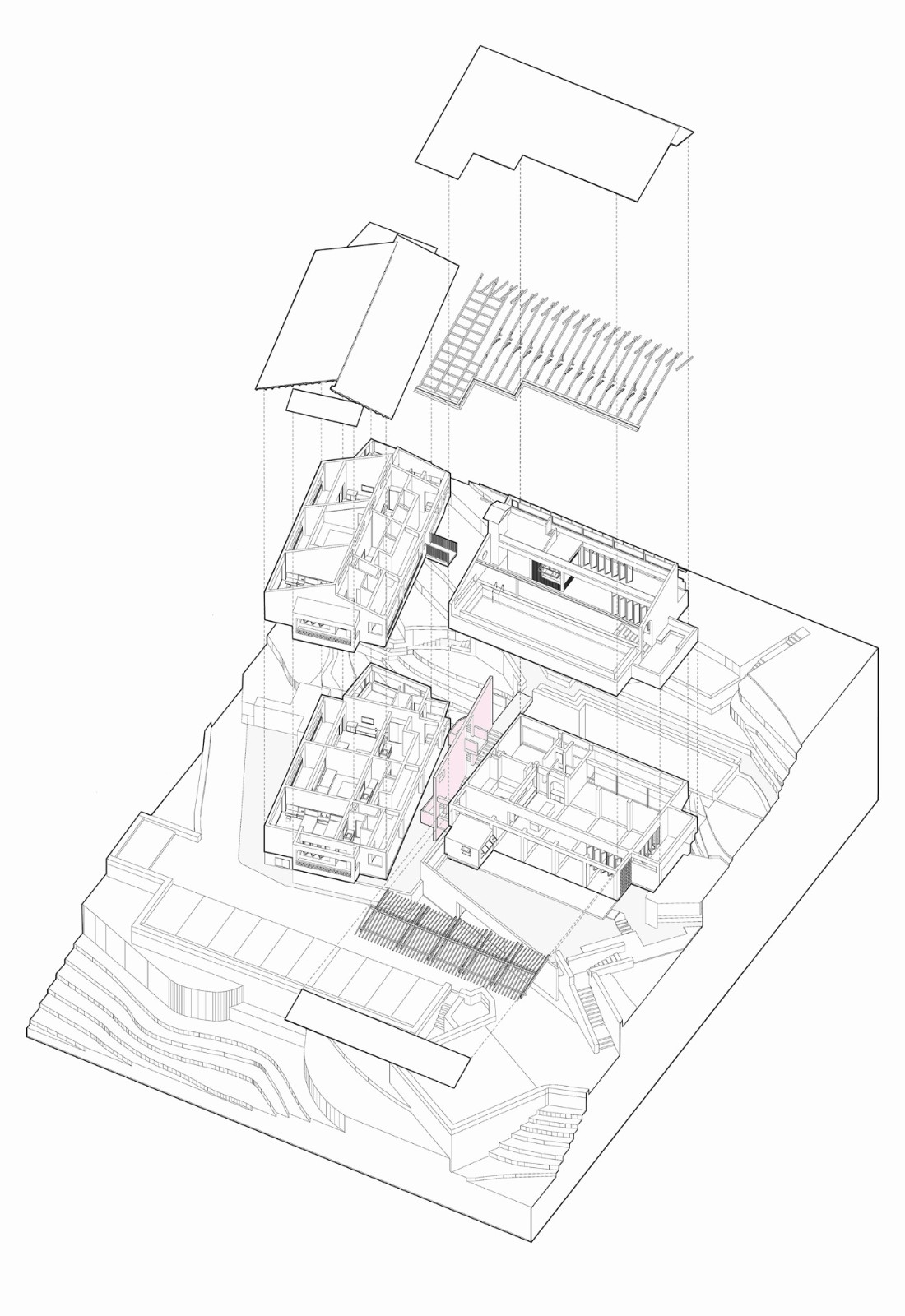 我们根据山地形态地貌和建筑基地落位,规划设计了观山、倚山、隐山三组建筑,在建筑与山体的这三种关系下,通过建筑和空间的设计引导,为人与自然建立新的互动关系,让人在建筑和空间的游走中,获得与自然交流和对话的新视角和新体验,形成了人与山之间关系的重构。