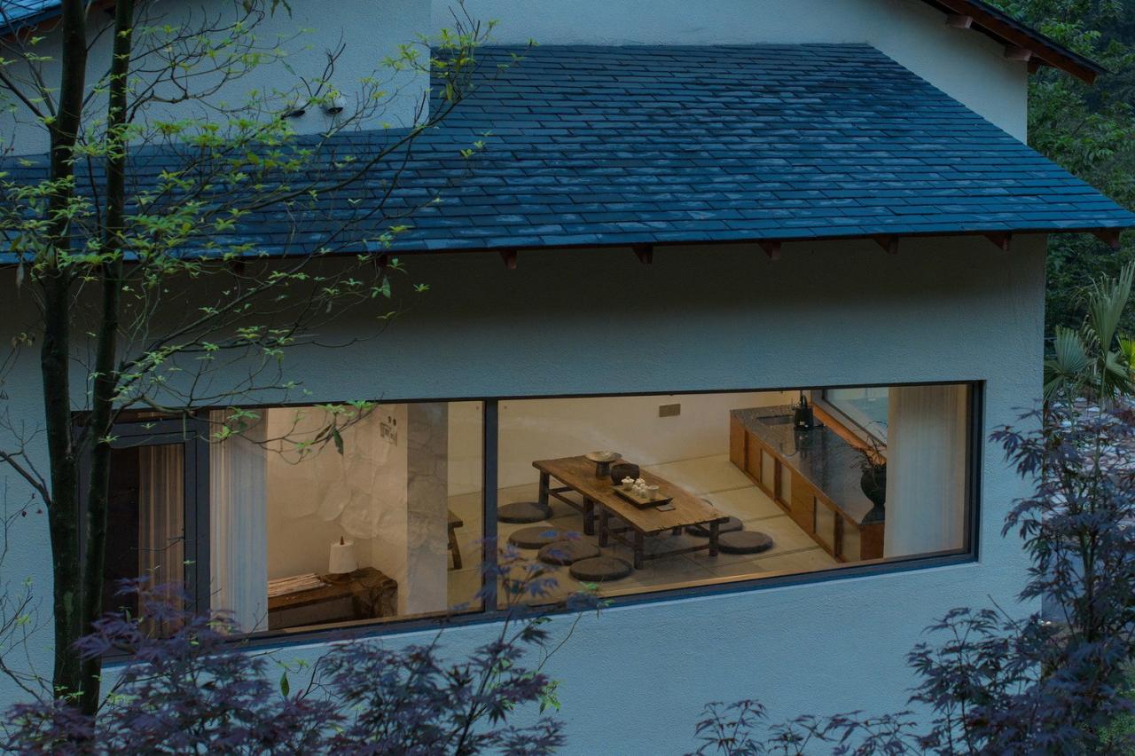 而在建构策略上,我们从尊重地形与气候出发,尽量利用原始宅基和吊脚楼吊层原理,减少山体土方开挖,保留了场地内的大部分巨石和树木,并纳入到与建筑空间的对话中。利用轻薄而出挑深远的大屋面,可以在多雨环境中对建筑的墙面与基础进行最大限度的保护,避免雨水冲刷和溅水侵蚀,极大的延长建筑寿命。
