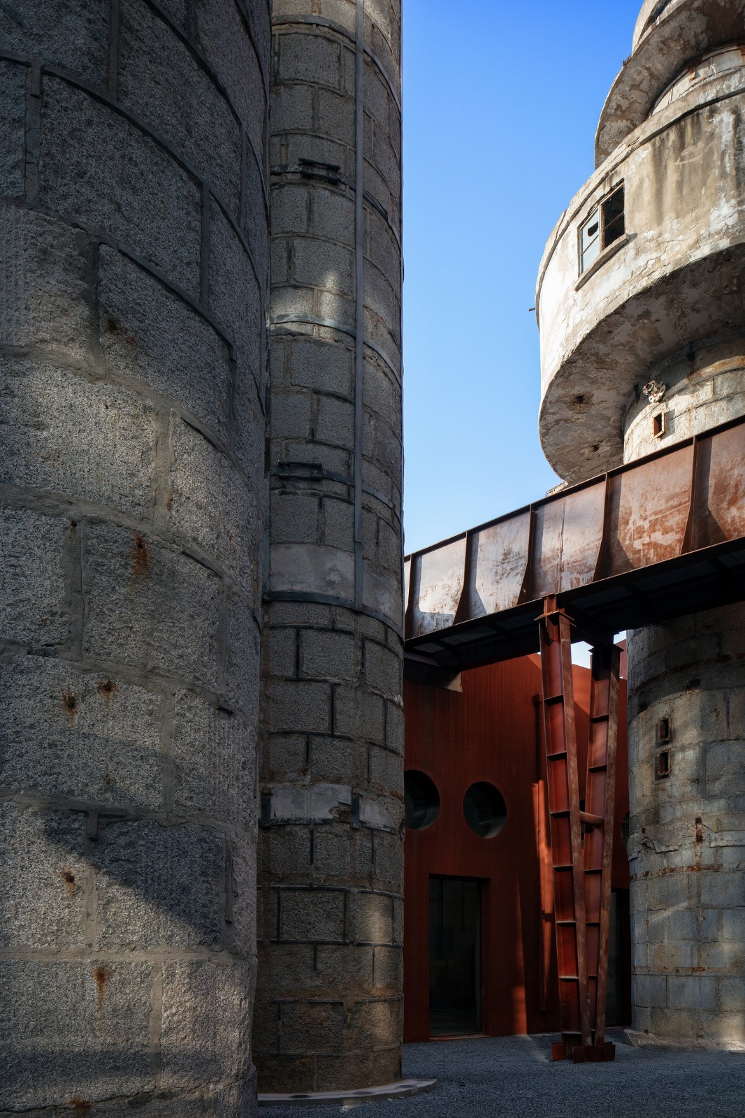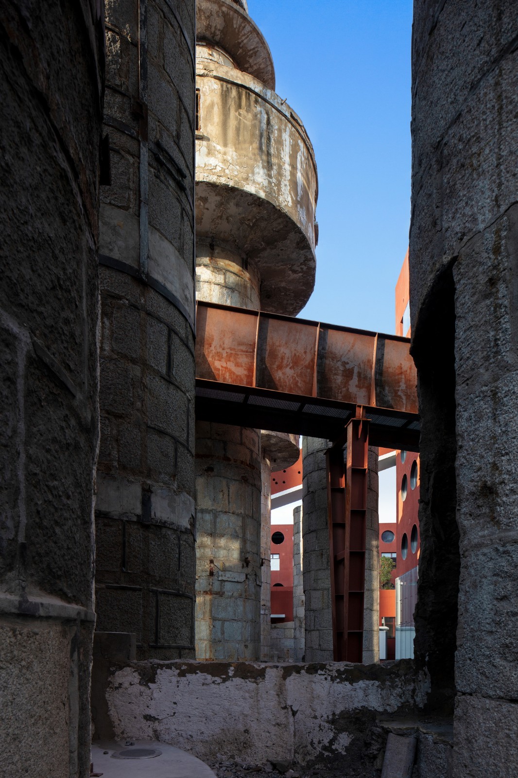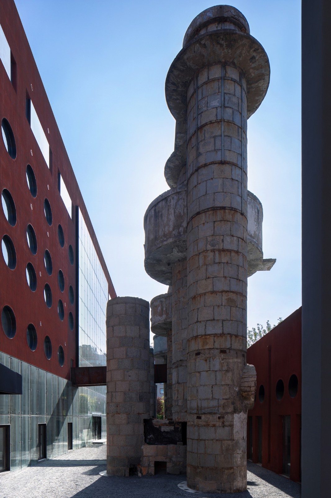 释放图腾相较于将历史精细美化的改造方式,原地建筑更敬畏工业遗迹自身粗犷的灵魂特质。朝向园区主入口的方向上,锅炉房正背两侧的外墙被切开,阳光洗过悬空的巨大煤斗洒落中庭,视线贯通前后。遮挡在建筑背后的4组共12座石砌除尘塔被从垃圾堆中一一清理出来、暴露于正对切口的庭院中心。静谧石塔阵列以极具识别性的粗野姿态矗立在空旷碎石之上,宛如神秘而震慑心魄的工业图腾。锅炉房室内杂乱隔墙中的锅炉基座被去除涂层、加固清理,一排排斑驳粗粝的混凝土柱列裸陈于首层清空的大厅。塔林、柱列、煤斗、后花园的高耸烟囱隔空对峙呼应,用各自的沧桑记忆在园区主轴上打下一连串深沉的时间锚点,将久已遗忘的工业力量唤醒释放。