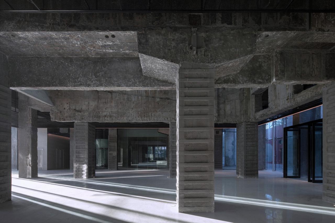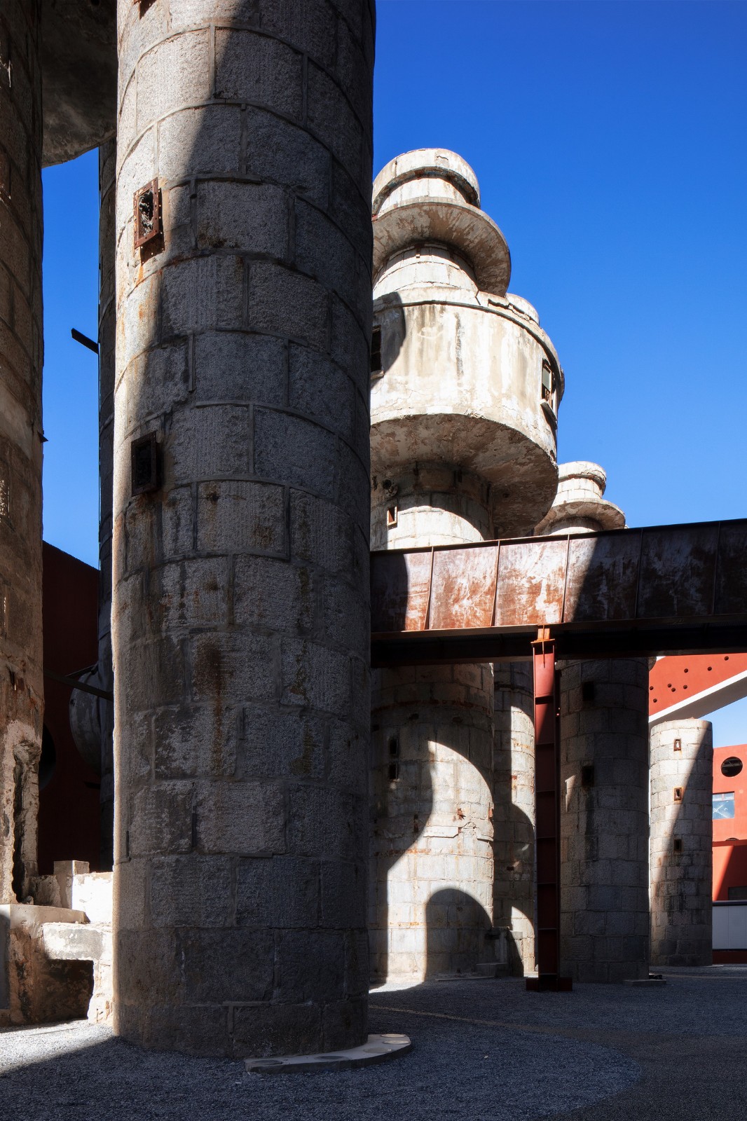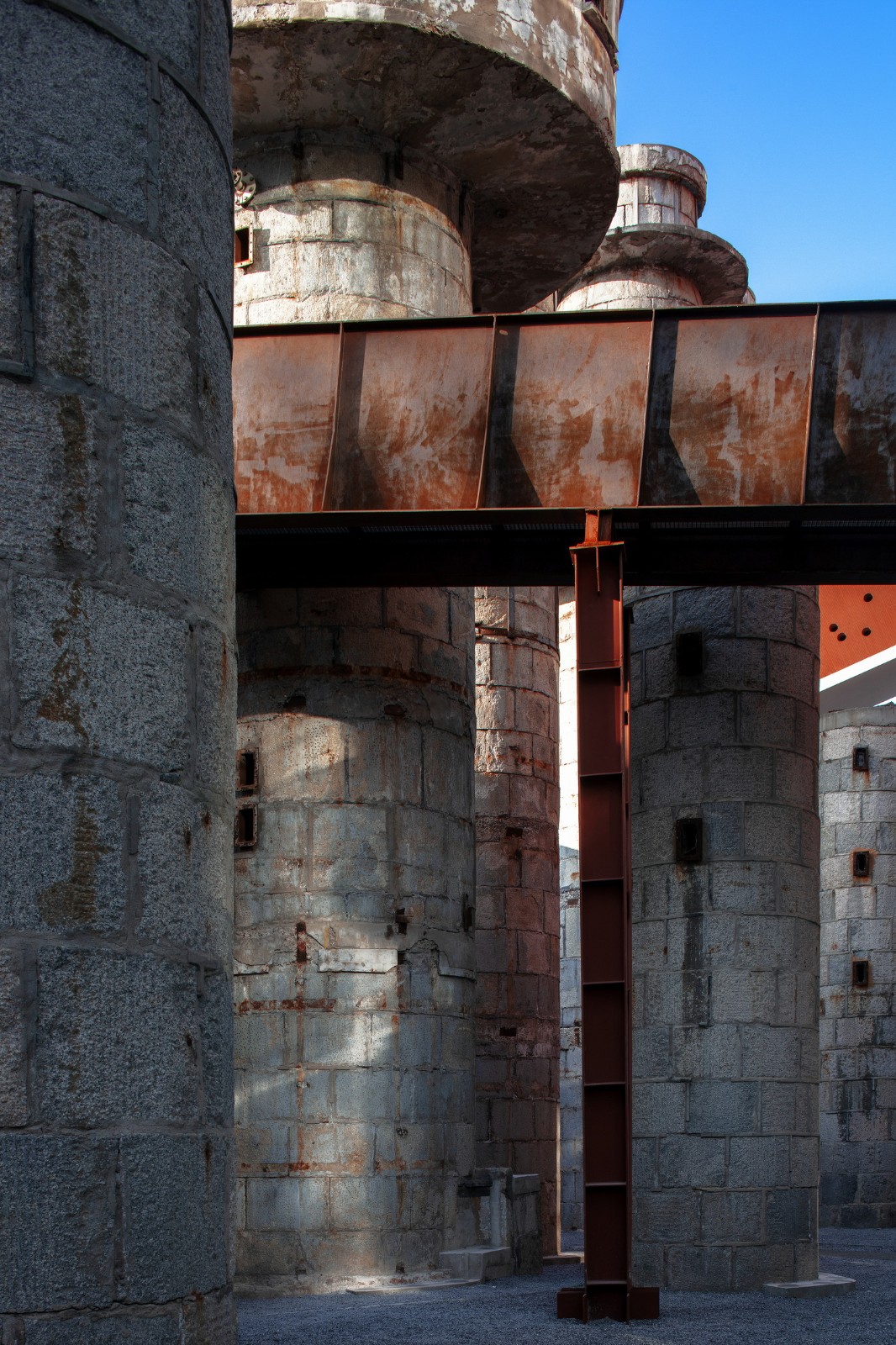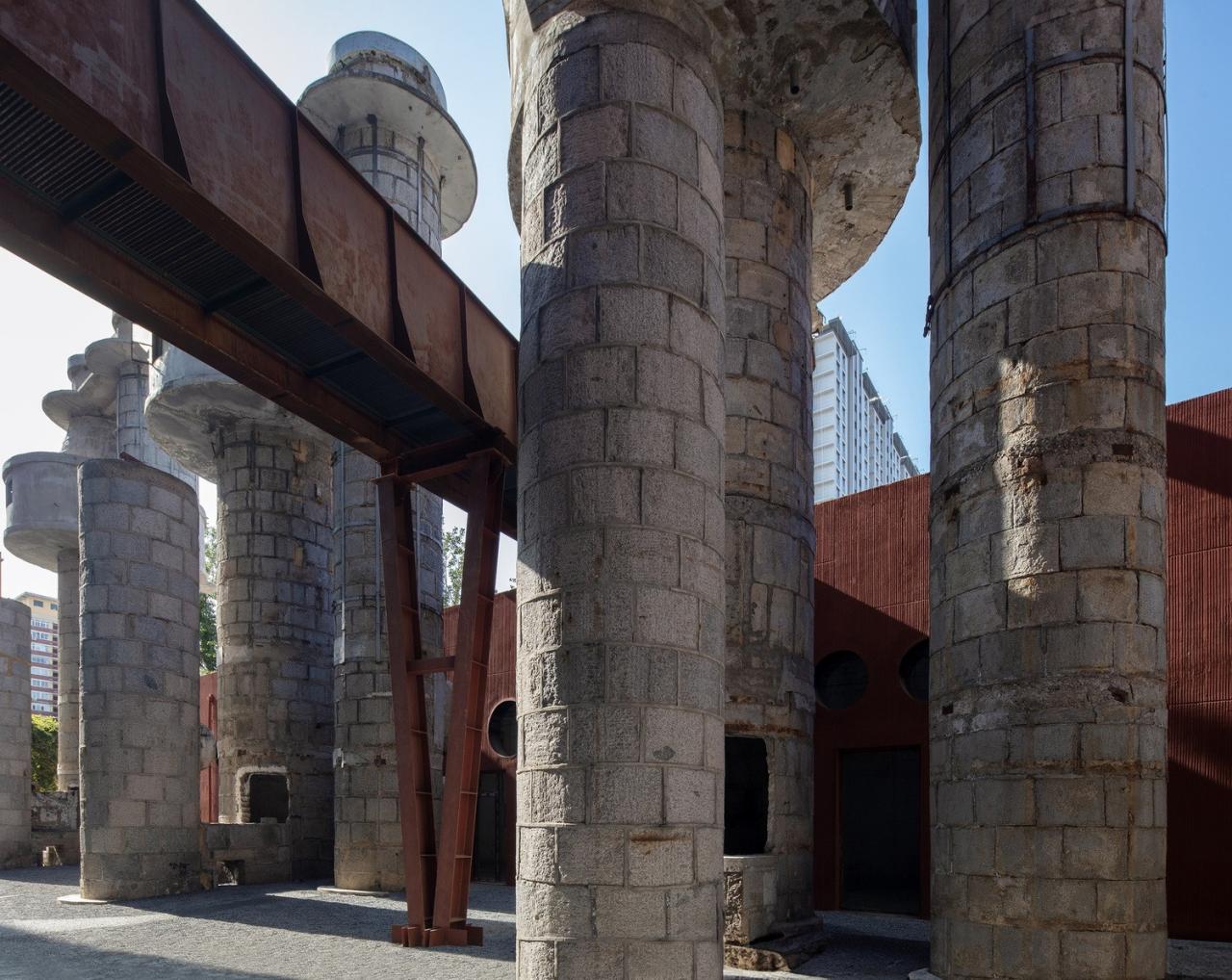 释放图腾相较于将历史精细美化的改造方式,原地建筑更敬畏工业遗迹自身粗犷的灵魂特质。朝向园区主入口的方向上,锅炉房正背两侧的外墙被切开,阳光洗过悬空的巨大煤斗洒落中庭,视线贯通前后。遮挡在建筑背后的4组共12座石砌除尘塔被从垃圾堆中一一清理出来、暴露于正对切口的庭院中心。静谧石塔阵列以极具识别性的粗野姿态矗立在空旷碎石之上,宛如神秘而震慑心魄的工业图腾。锅炉房室内杂乱隔墙中的锅炉基座被去除涂层、加固清理,一排排斑驳粗粝的混凝土柱列裸陈于首层清空的大厅。塔林、柱列、煤斗、后花园的高耸烟囱隔空对峙呼应,用各自的沧桑记忆在园区主轴上打下一连串深沉的时间锚点,将久已遗忘的工业力量唤醒释放。