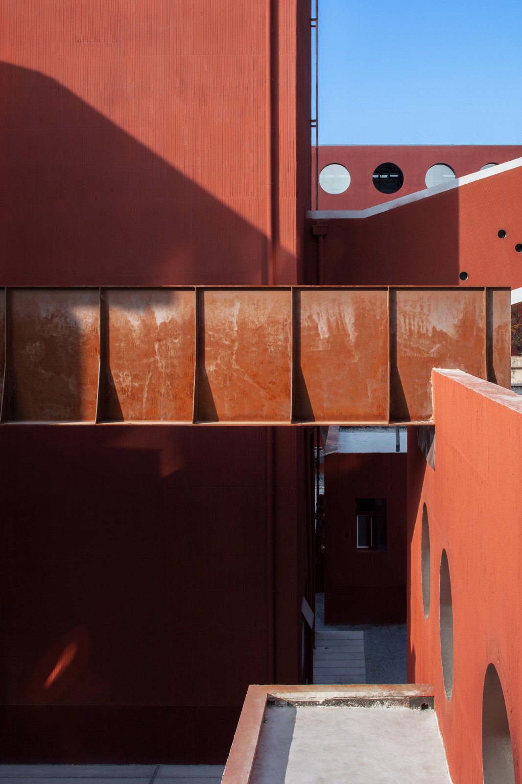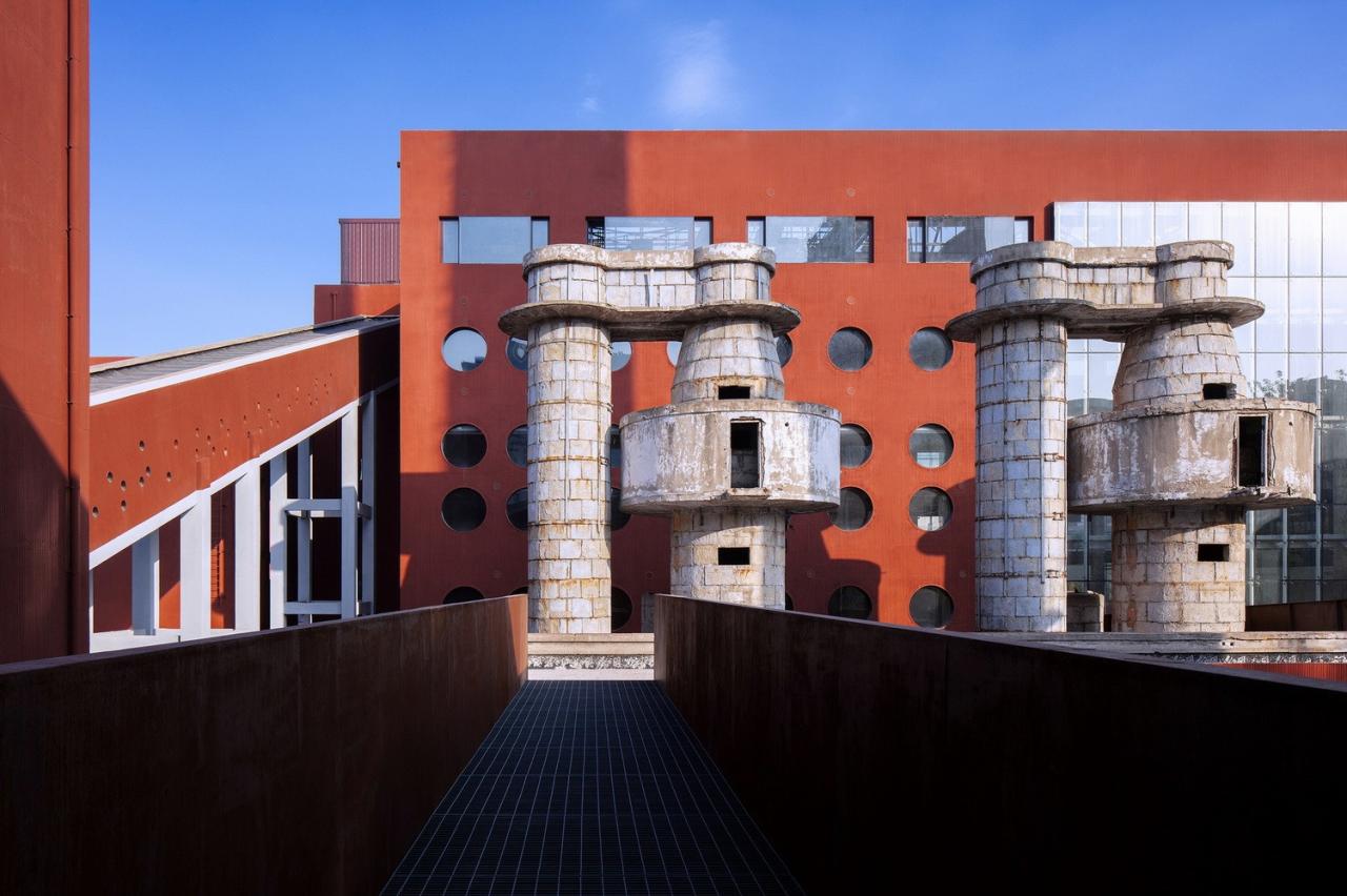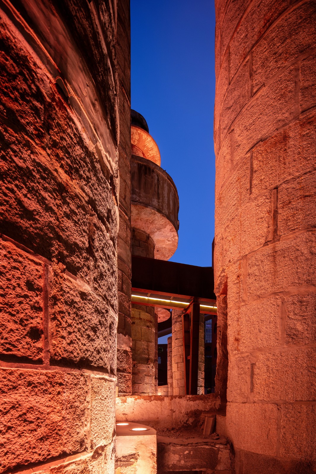 整段重型耐候槽钢为结构的钢桥从塔林缝隙中穿过,与厚重石塔进行着力量与时间的抗衡;光滑而脆弱的玻璃栈道贯通高空煤斗内部,映射出岁月的反差;金属网阶梯小径沿墙攀爬,在外墙留下纤细光影……这些新植入的插件与旧有结构形成对话,创造近距离抚触各处工业遗迹的契机,在室内中庭、空中露台、地面花园、烟囱登高梯、运动中心之间建立起广泛连接与持续流动。