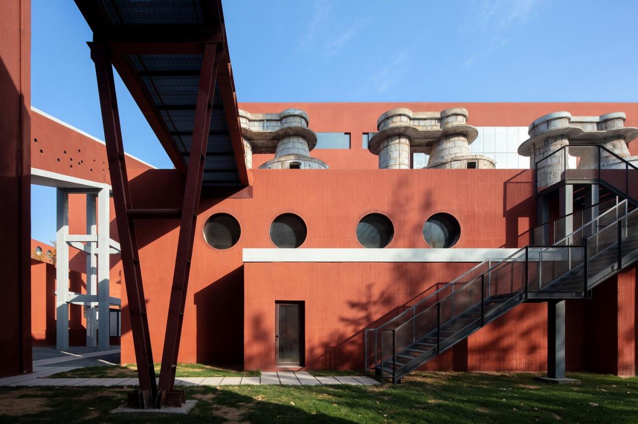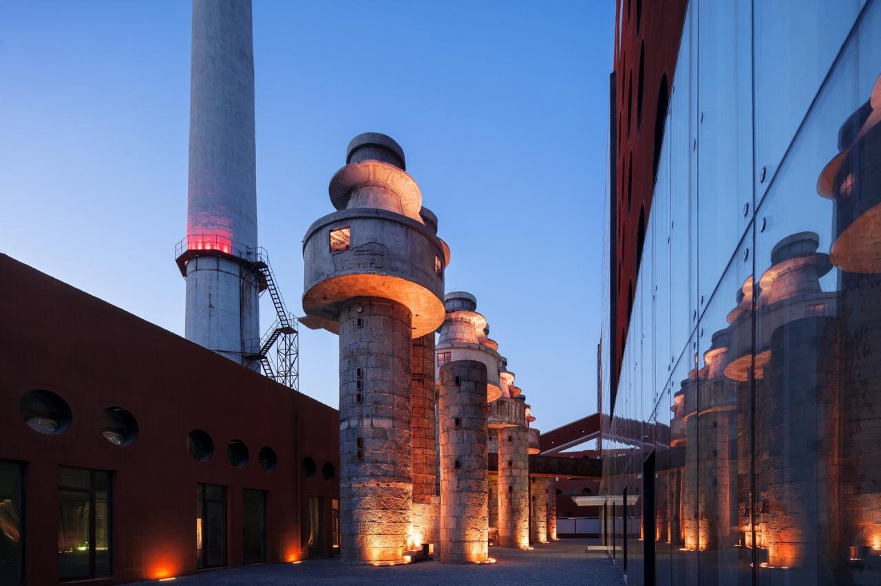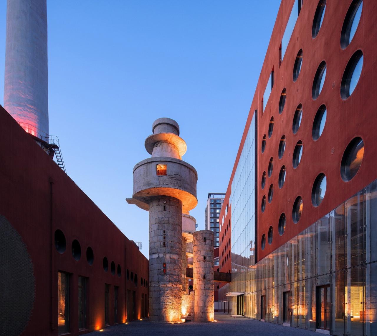 整段重型耐候槽钢为结构的钢桥从塔林缝隙中穿过,与厚重石塔进行着力量与时间的抗衡;光滑而脆弱的玻璃栈道贯通高空煤斗内部,映射出岁月的反差;金属网阶梯小径沿墙攀爬,在外墙留下纤细光影……这些新植入的插件与旧有结构形成对话,创造近距离抚触各处工业遗迹的契机,在室内中庭、空中露台、地面花园、烟囱登高梯、运动中心之间建立起广泛连接与持续流动。