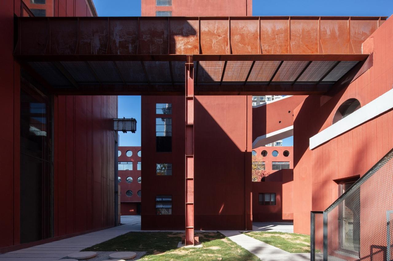 重燃越界锦荟园采取有机更新、循序渐进的策略应对后疫情时代,空间改造分期实施、业态运营逐步养育磨合,尚需伴随时间慢慢成熟。园内地面景观以大面积碎石和混凝土块料步道作为工业遗迹的衬托,围绕它们形成尺度丰富的室外活动场所。建筑群则被覆以特制的暗红色粗纹质感涂层,随光线变化有时深沉、有时热烈,与夜晚点亮塔林的红光一起,调和出园区整体的温暖调性。这既是对过往燃煤时代火焰的隐喻,也蕴含了当下人们对希望之火重燃、对未来经济复苏的憧憬与热盼。