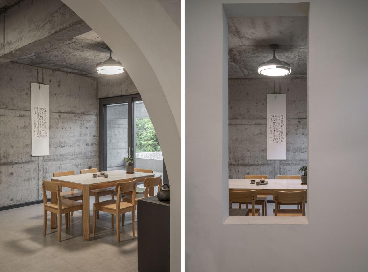 方圆角折几何与自然的相互参照是《崖之家》空间美的来源。建筑采用方、圆、角、折等四个动作去回应地方生活:“方”是客厅和卧室,即规矩的居住日常;“圆”是入口和天窗,即感性的侧脸;“角”是山形,也是走向内心的冥想空间;“折”是围墙,是对周围环境的包裹和容纳。室内设计延续了几何的手法,让光在一天中的不同时段从不同角度进入建筑的内部。青川和断崖是山的两种形式,后者更接近于山的剖面,二者共同见证了草木荣枯的内在循环。不同类型的开窗对景山体的不同侧面,让建筑和人共同见证生命的往复循环。