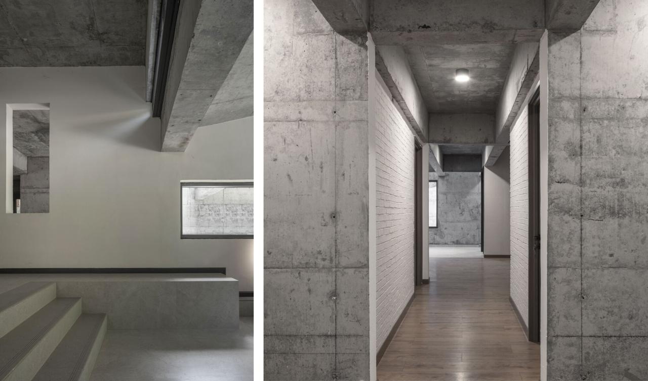 粗粝细腻如今有不少人喜欢清水混凝土,但是他们喜欢的并不是它原始的粗粝质感,而是经过处理的丝滑表面,作为混凝土重要组分的砂石骨料,最初是从山里开采出来的,当看到崖壁时,我们会意识到丝滑根本就不是它原本的属性,混凝土应该保持它如顽石一般粗粝的质感。然而粗粝亦可细腻,我们以不同方式观察四季变化,与来自八方的光线不期而遇,这一切会给建筑带来绵密的气息。