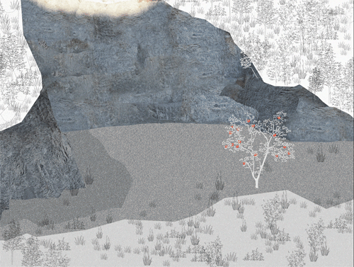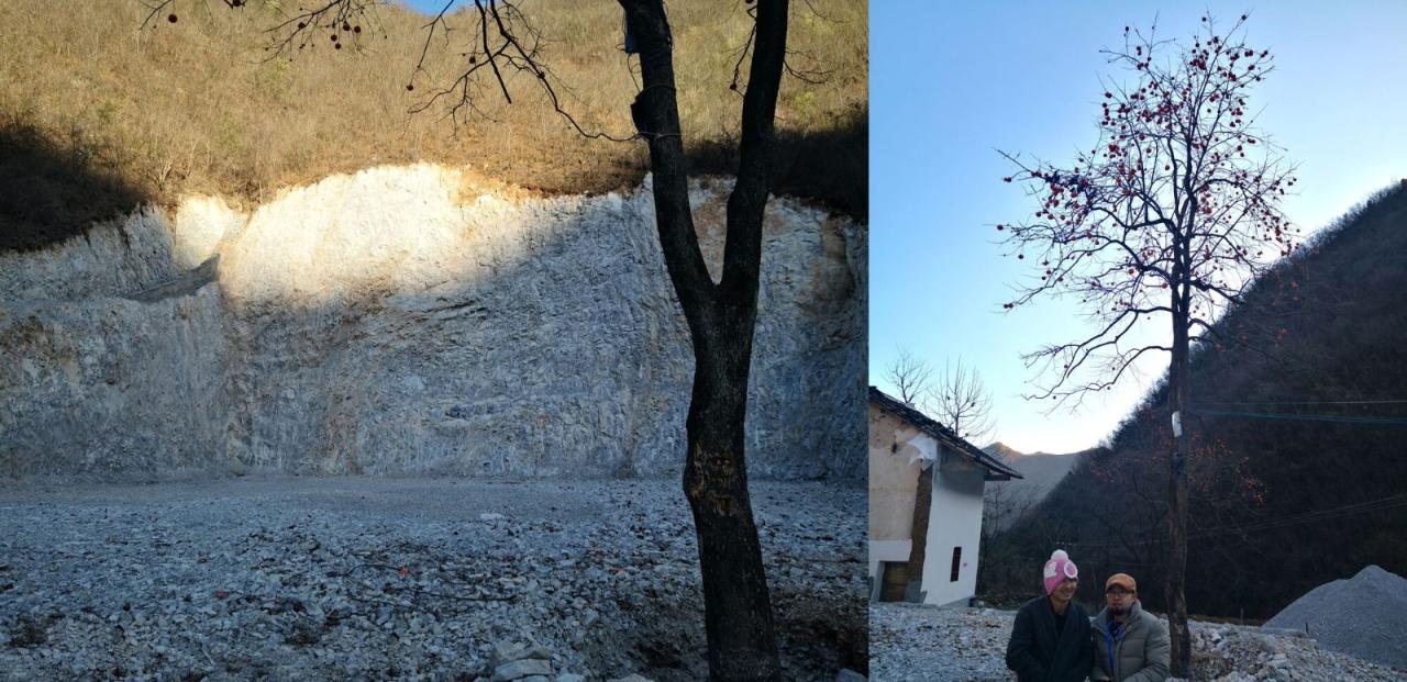 郧西县,这个位于湖北十堰的小县城北依秦岭,南临汉江。境内多山,交通不便,二十米见方的靠崖基地藏在大山深处,是主人通过开挖北侧数十米高的山坡获得的,崖壁极其坚硬,其纹理粗糙,如巨人手掌一般扑面而来。开工已是深秋,南面苍山如笑,院里的柿子树已经结果,留下它,完工时面对青山品茗之时可以摘下火红的柿子伴茶鲜。基地山谷幽静,林木葱郁,断崖阻隔了北来的寒风,把建筑包裹在里面。山峰的角、崖壁的直、山路的曲,这一切都在提示一种几何化的东西。