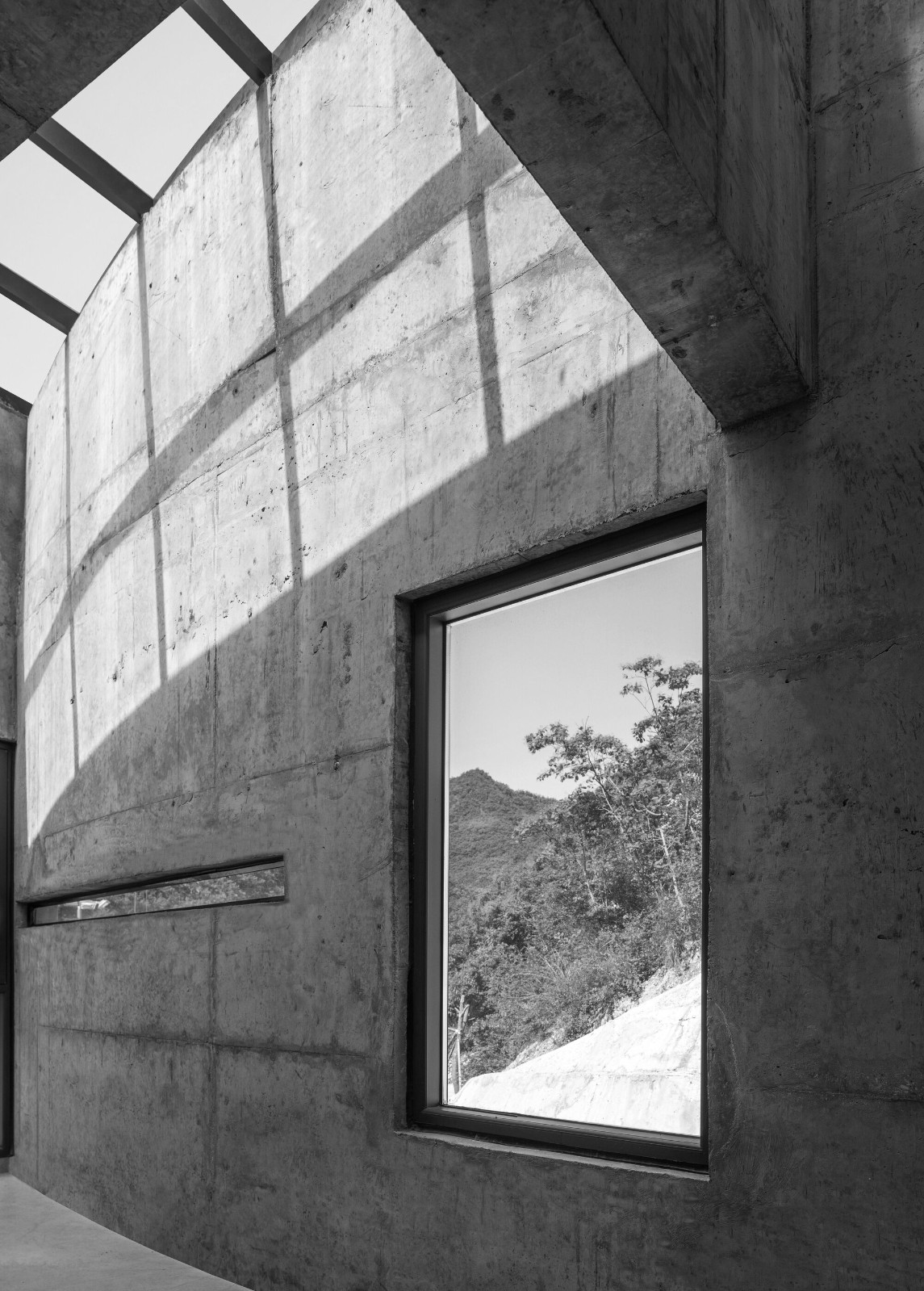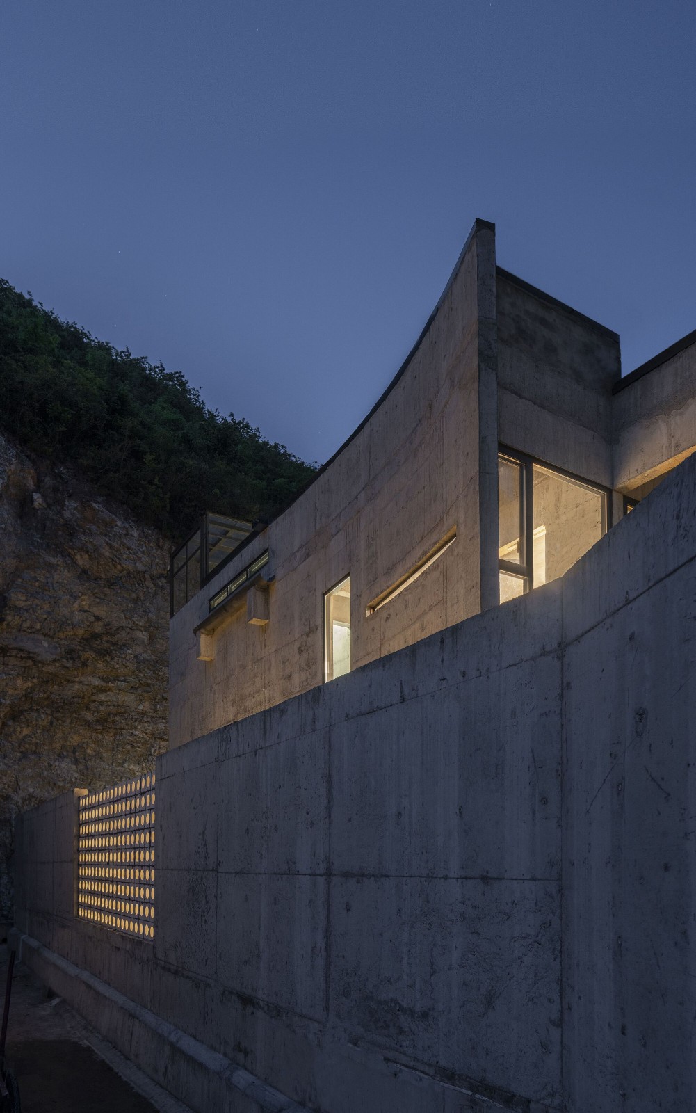 建筑的围墙斜向转折包围西侧山体,形成窄小的入口,二层以弧墙呼应山体的走势,横梁巨大,突出在南北两侧,似从山崖里生长出来。房子北面逼近山崖,形成一个狭长的线性庭园,南侧则面向青山敞开去拥抱自然,屋顶锥形的空间回应了山峦,里面仅有两个圆窗能够看到外部风景,光线来自头顶,是独自面对自我的内省空间。