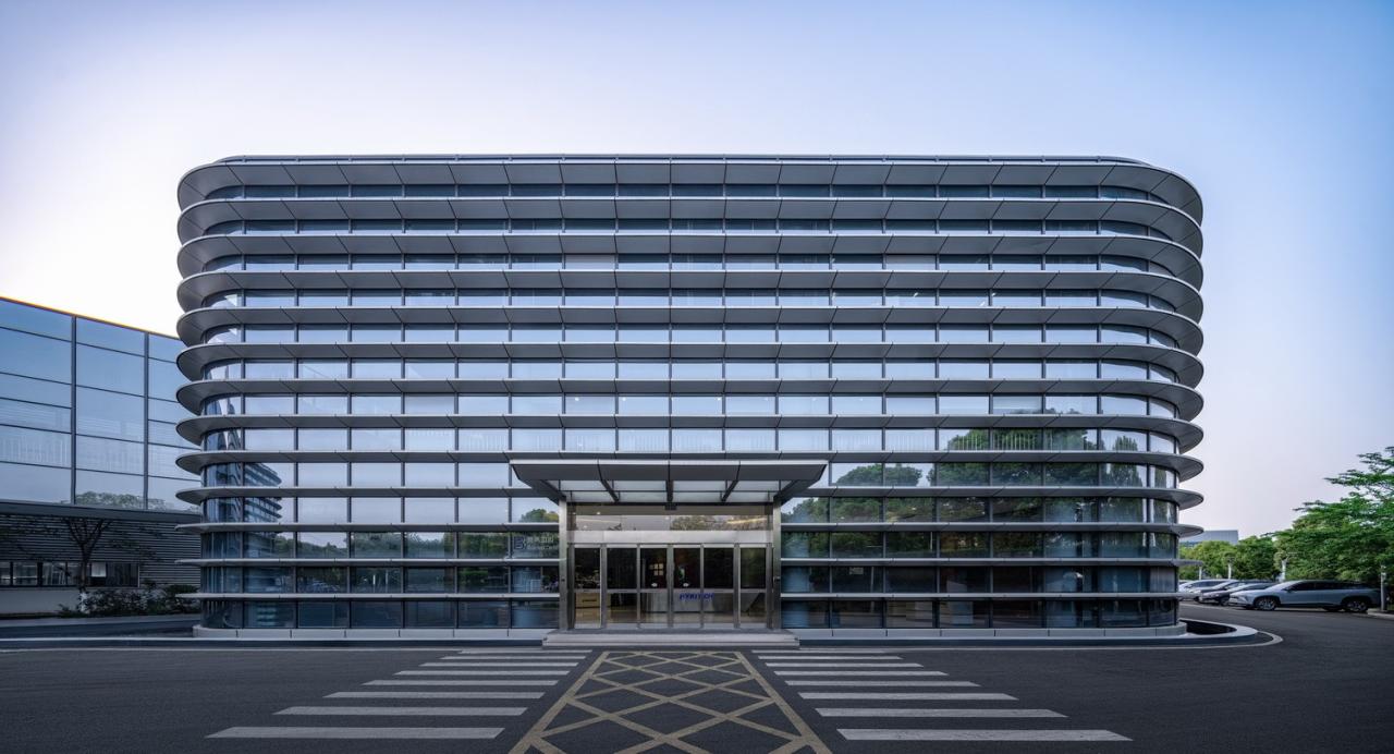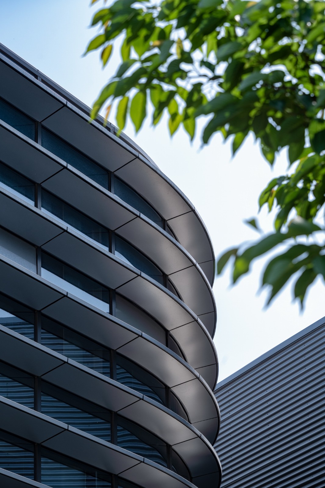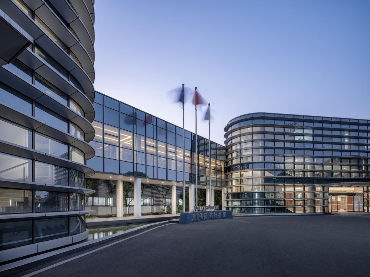 流线型的建筑体采用玻璃幕墙外立面,其上均布着铝合金水平遮阳构件,金属构件的水平运动强化了建筑的流线感,在视觉上使公共建筑和生产车间保持了一致的面貌,尽管二者在立面和空间上仅仅是一些细小的造型变化,但是整个建筑的层次由于变化的介入而丰富起来,线与面的交叠,塑造了建筑独特的形象。当树木逐渐繁盛,填充了那些我们留置出来的空间。透过阳光闪烁和婆娑树影,建筑在咫尺之间映射出自然的丰富。