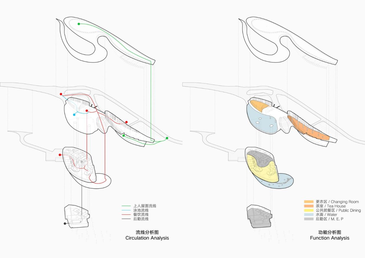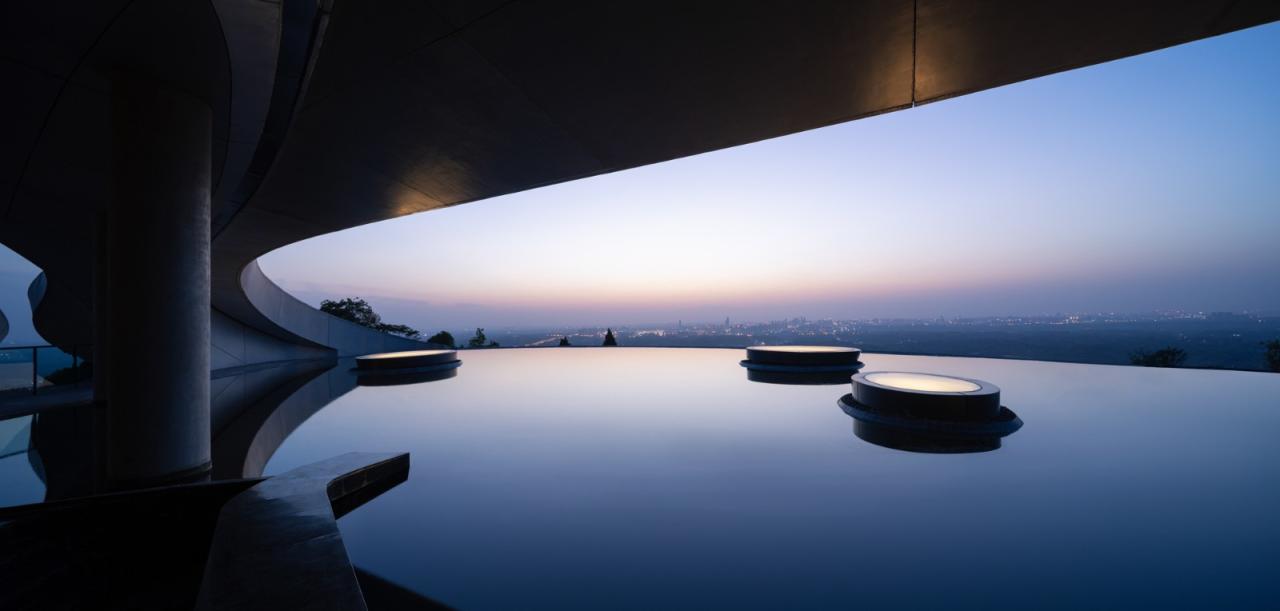 屋面下由景观水池和泳池合而为一的连续水面映射出天空的颜色,水面的边界也消融在远方的天际线中。多功能厅以及泳池辅助性功能空间退回到水面之后,留给泳池更开放的观景视野。餐厅被环绕在同样开放视觉体验的景观水池之间,主体部分探身到山体之外,以获得更好的观景体验。而后勤功能等体验感较弱的部分则覆盖在挑檐之下或藏在场地之中。
