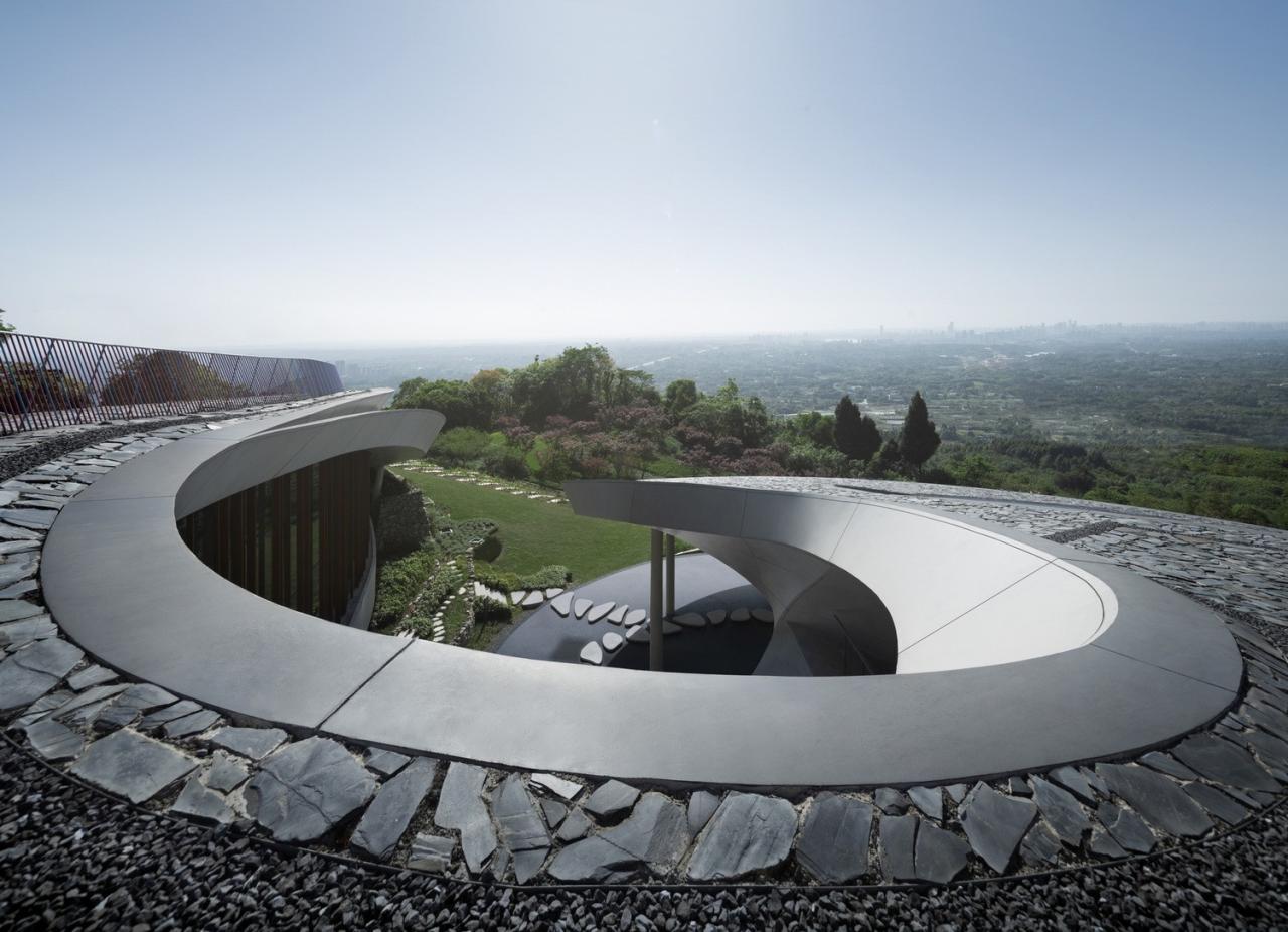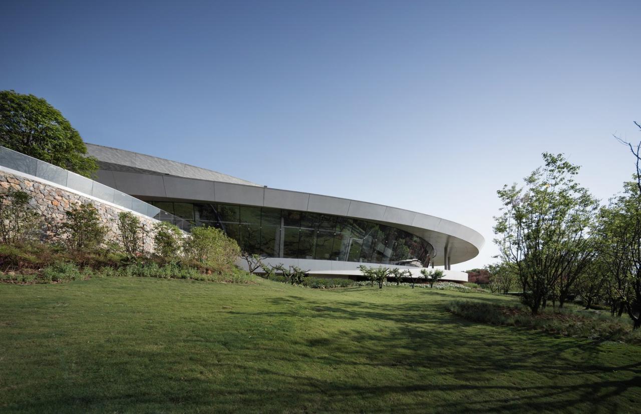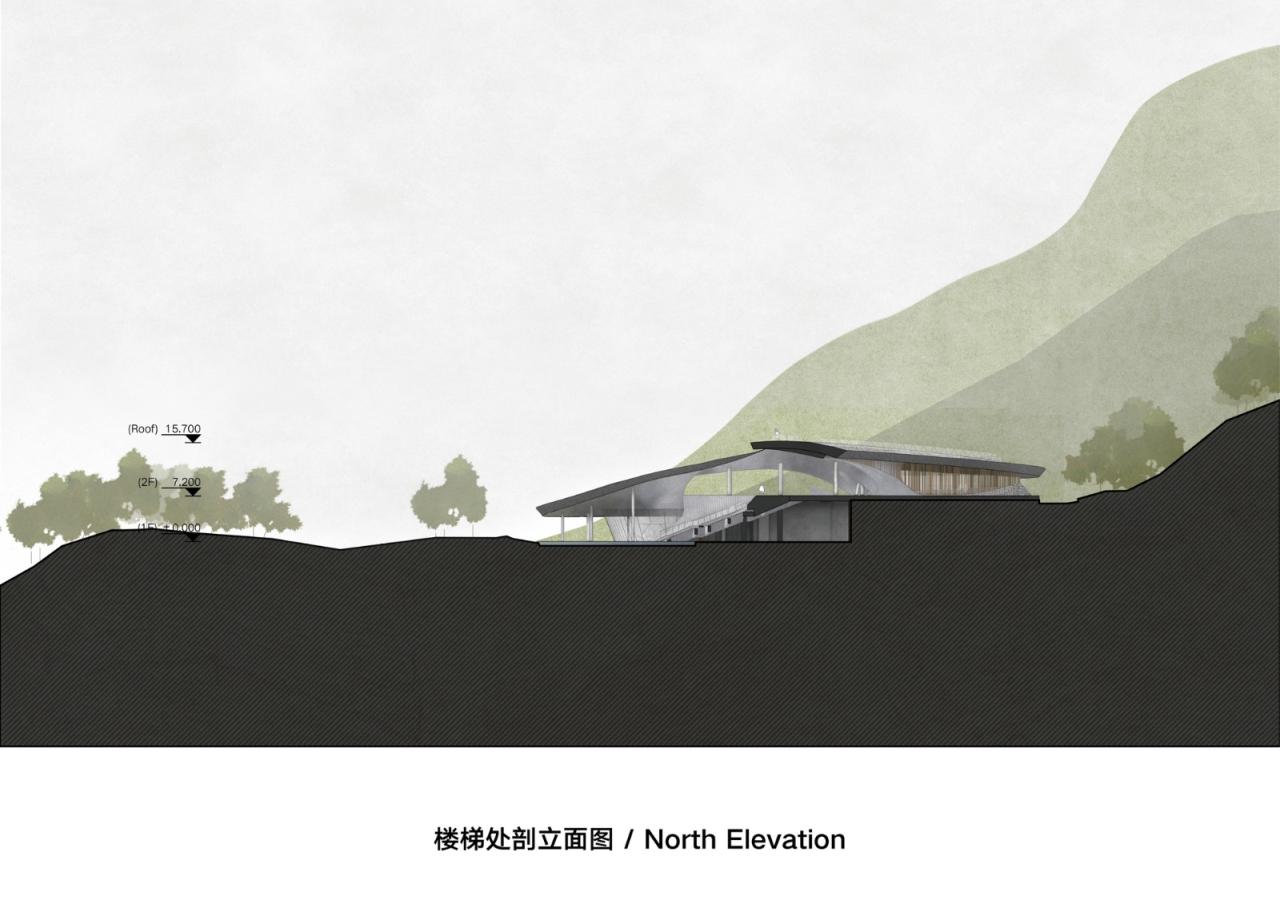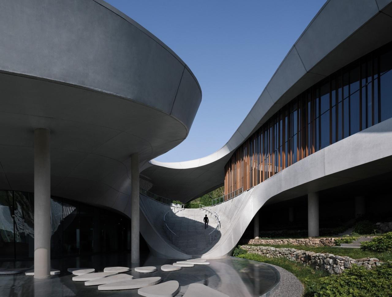 建筑本身具有强烈特质性与地标性,从某些角度像一个飞船或者天外来客,蓄势待发;同时又足够的消隐甚至软化,使其不对已有的自然环境构成威胁和抵触,像一个地表的褶皱或者林间的飞桥,若隐若现。