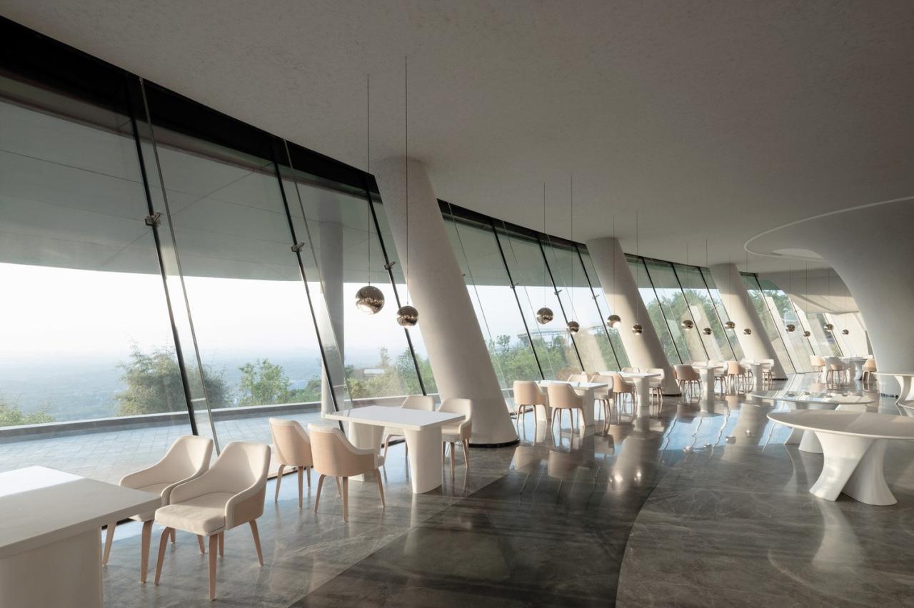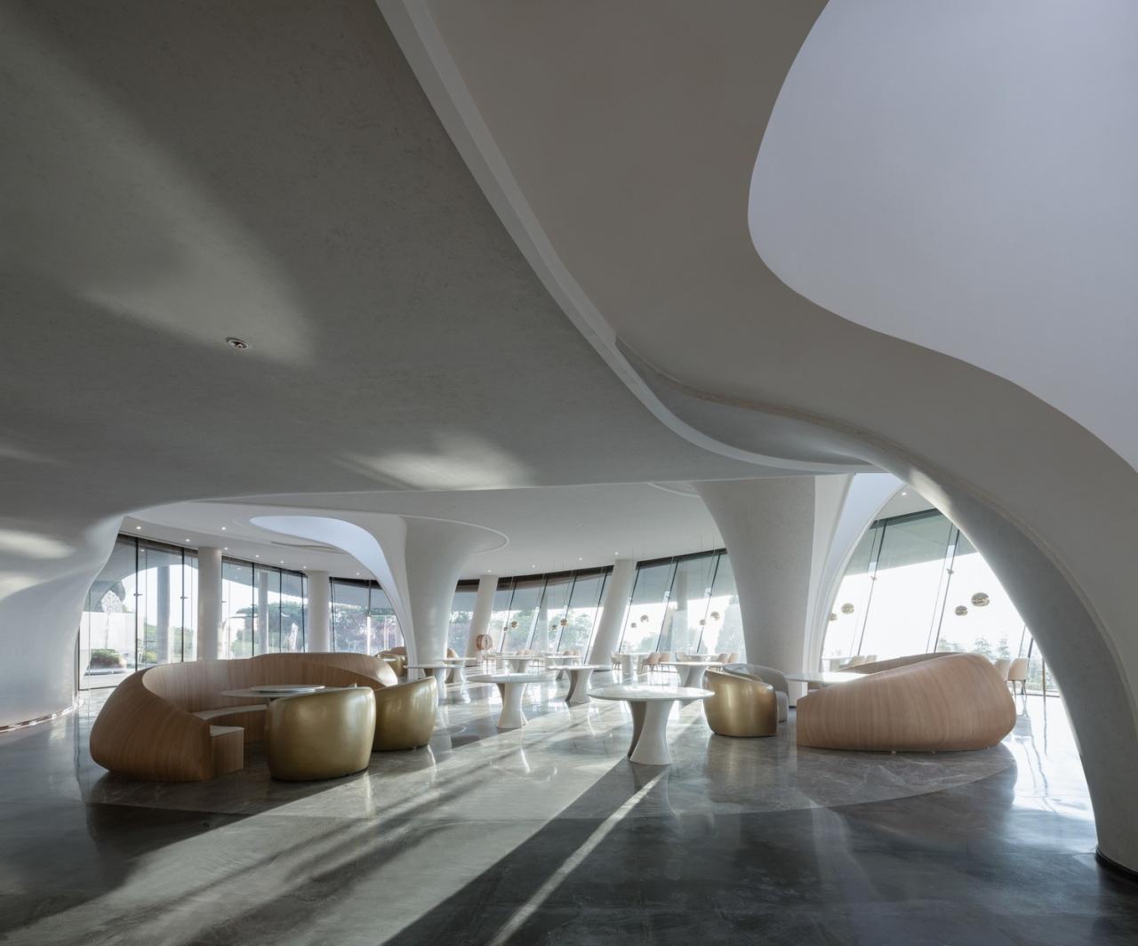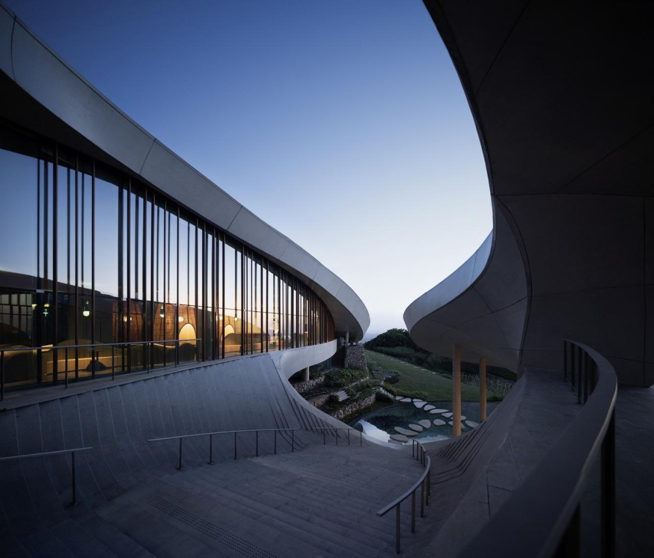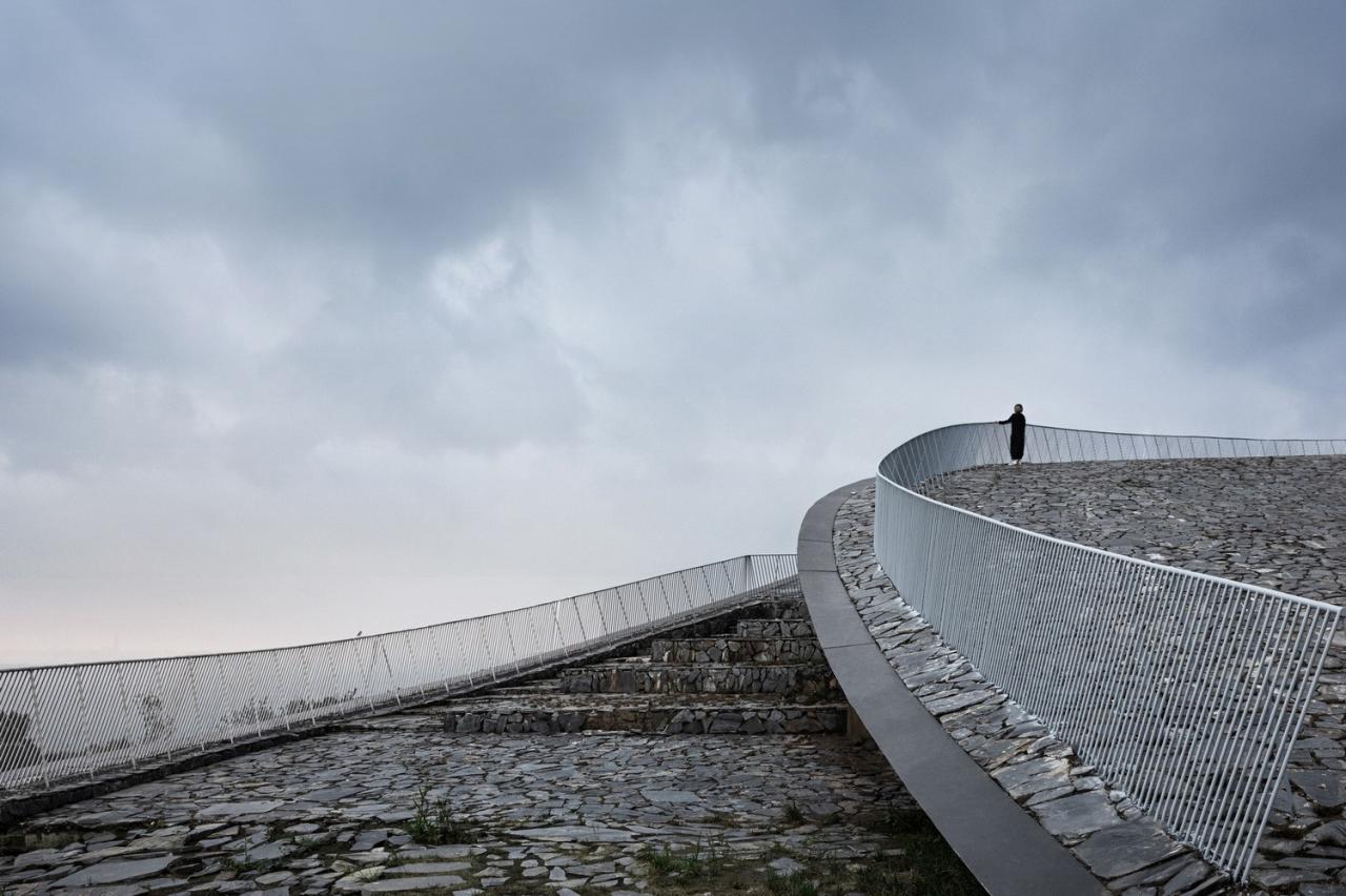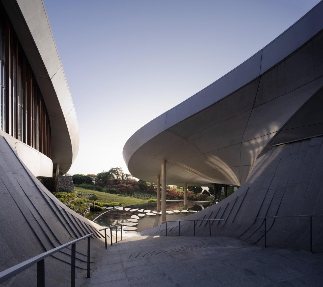 建筑本身具有强烈特质性与地标性,从某些角度像一个飞船或者天外来客,蓄势待发;同时又足够的消隐甚至软化,使其不对已有的自然环境构成威胁和抵触,像一个地表的褶皱或者林间的飞桥,若隐若现。