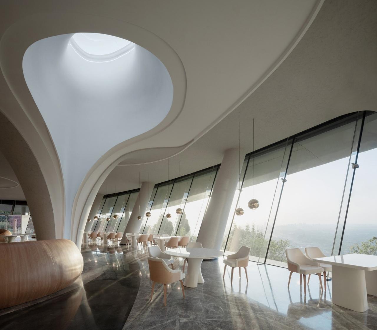 龙泉山镜.高空平台,作为成都市区至高点上的建筑物,理应是“流动的”,“消融的”,“景观的”。故而,设计通过“人工”的手段在“自然”之中去获取一种对于大型“景观”的回应或对话,使这栋建筑并未突兀的立在山中,反而更像是一块隆起的地表,以一种具有流动性的状态去回应与山体的关系。“匍匐”的姿态首先是对“成都平原”的这一地貌的映射,建立一种非常强的横向延展关系。这种横向关系又是由一系列不同高差下但又相对连续的水平方向界面组成,延展性也在流动的平面里产生。