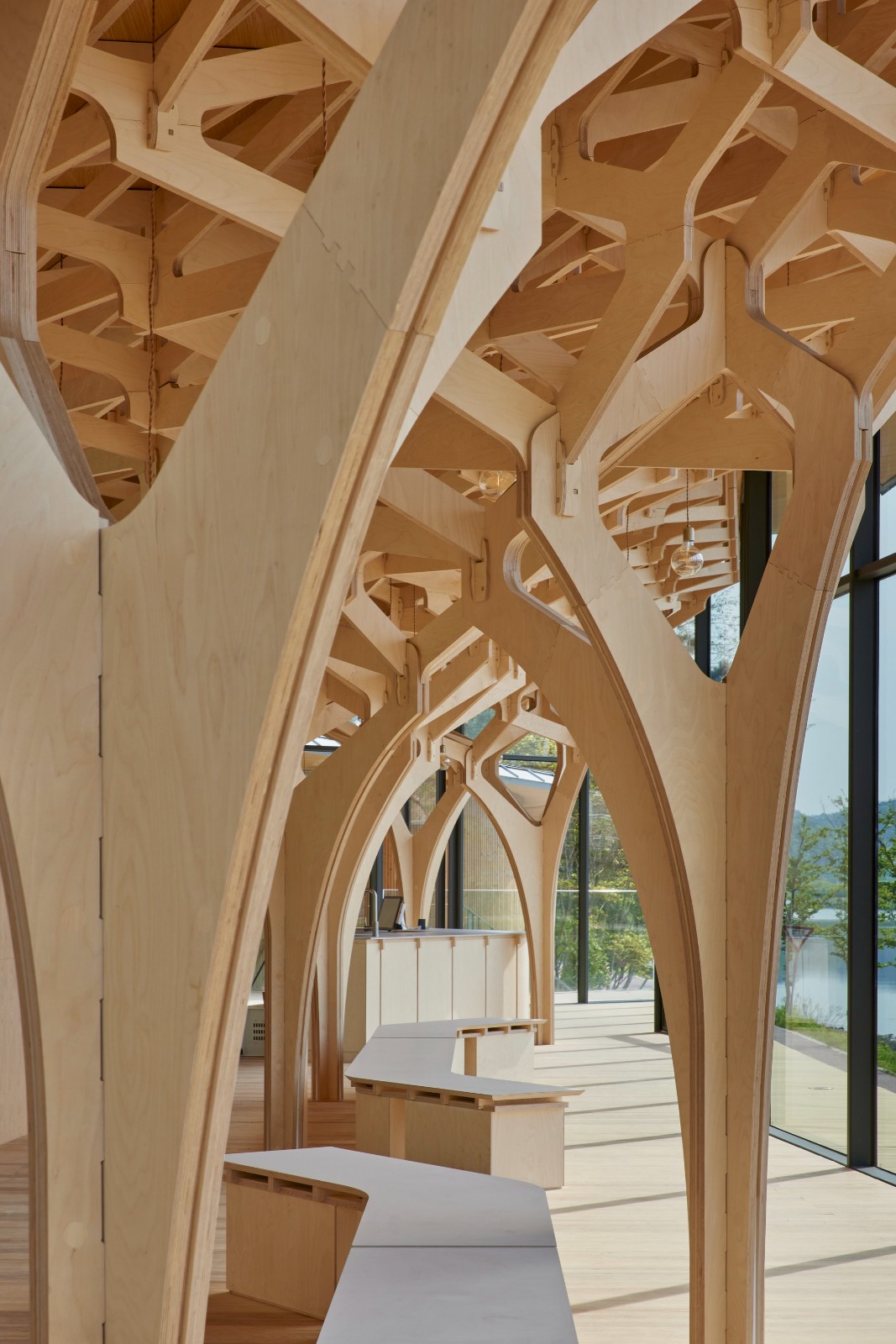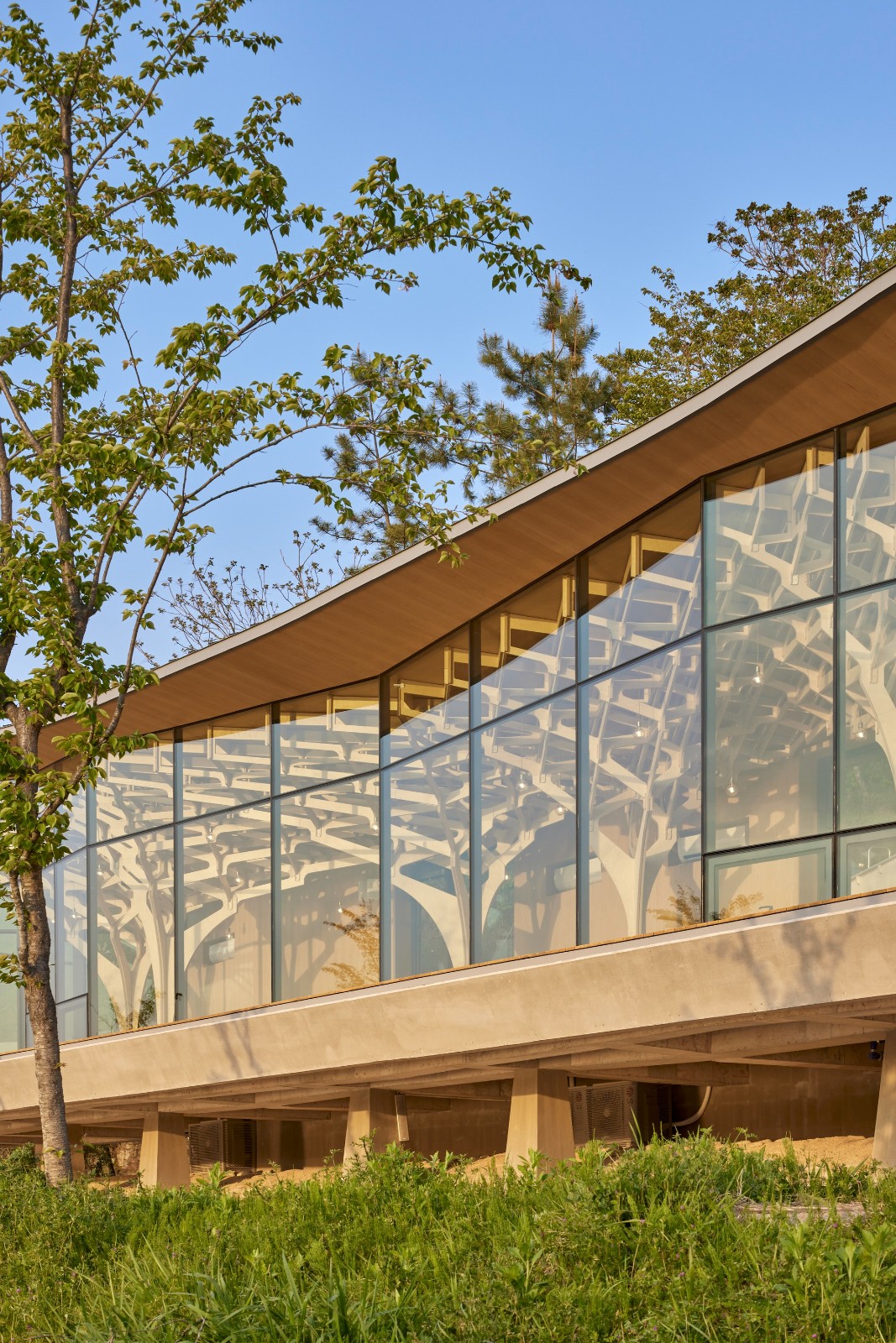 该项目还是游客可以体验自然和城市环境的场所。在城市化之前,江畔周围都是竹林。受到这一失去的场景和城市记忆的启发,树柱间生成了一条类似于森林之间小径的室内空间。此外,三面的玻璃墙模糊了内外界限,实现了开放性的理念。最后,树状结构创造了项目的特点,首先是其独特的室内氛围,其次是外观上的象征性形象。