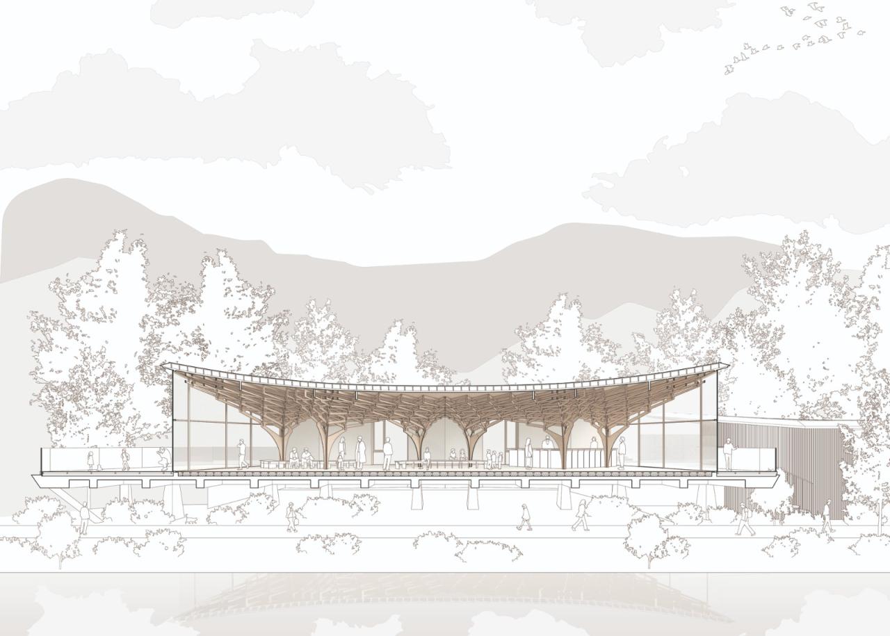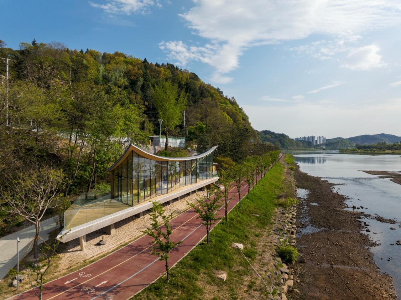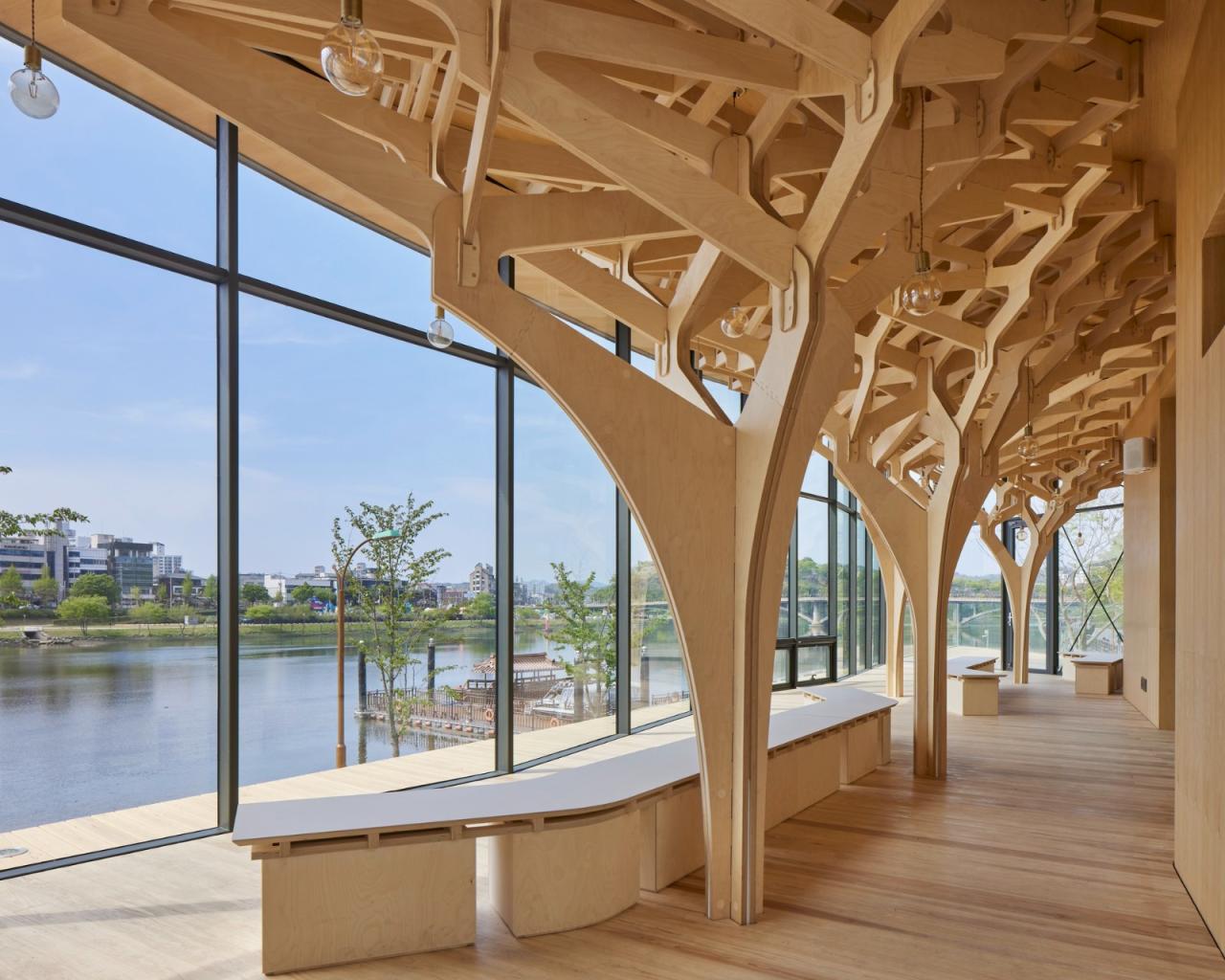 “浮光亭”旨在重塑东亚木结构建筑,尤其是“-ru”,即东亚规模更大的亭子。项目的六根类似树木的柱子重新创造了传统的组装技术和结构系统,如木制支架。这些树结构向1365年在韩国晋州市(项目所在地)建造的 Chokseok-ru 的正立面六根柱子致敬,该建筑是晋州市最具象征意义的建筑。