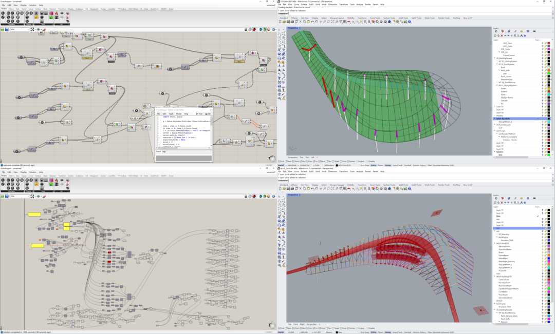奥雅纳结构设计团队应用Rhino + Grasshopper + Python参数化建模设计流程,在建筑师提供的初始几何形体基础上,结合建筑造型特点和结构受力原则的基本逻辑,设置了一系列几何、材料、力学性能等参数,及生成灵活可调的参数化结构几何模型。